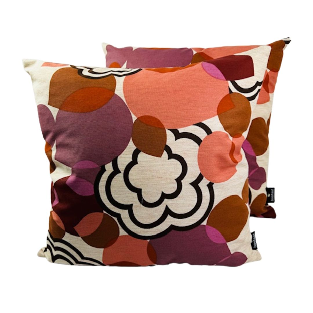Deze retro kussens zijn handgemaakt van originele vintage stof van het merk Aristo. Een prachtig Seventies patroon met vrolijke bloemen en prachtige kleuren. Natuurlijk is de voor- en achterkant van deze kussens van dezelfde stof. Door het patroon op de stof zijn de voor- en achterkant nooit hetzelfde. Deze originele jaren '70 stofĀ is mooi van kleur en goed te combineren met veel andere kussens. Wat een heerlijke kleuren waren er toch in de seventies. Wat vind je van deze prachtige kleurencombinatie?