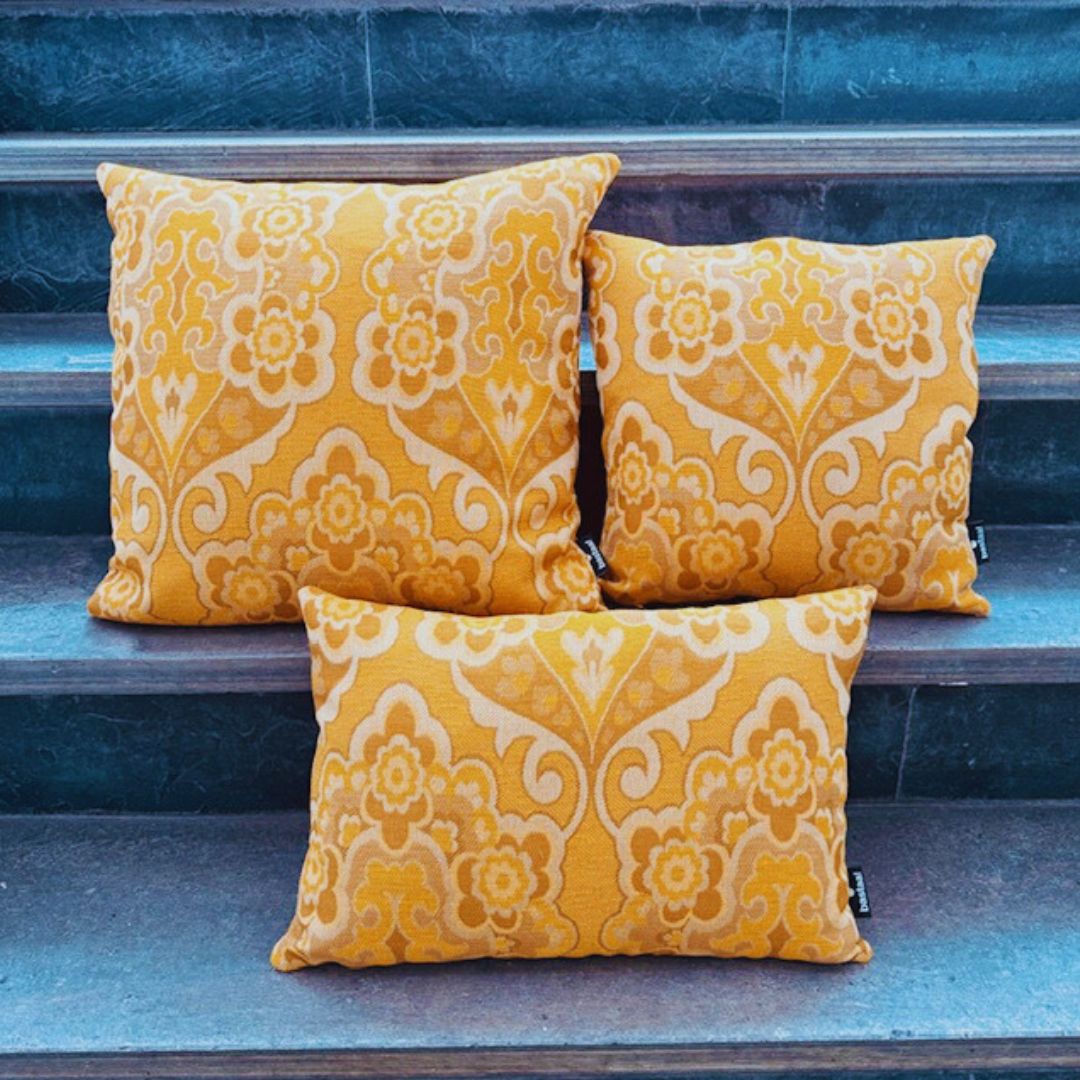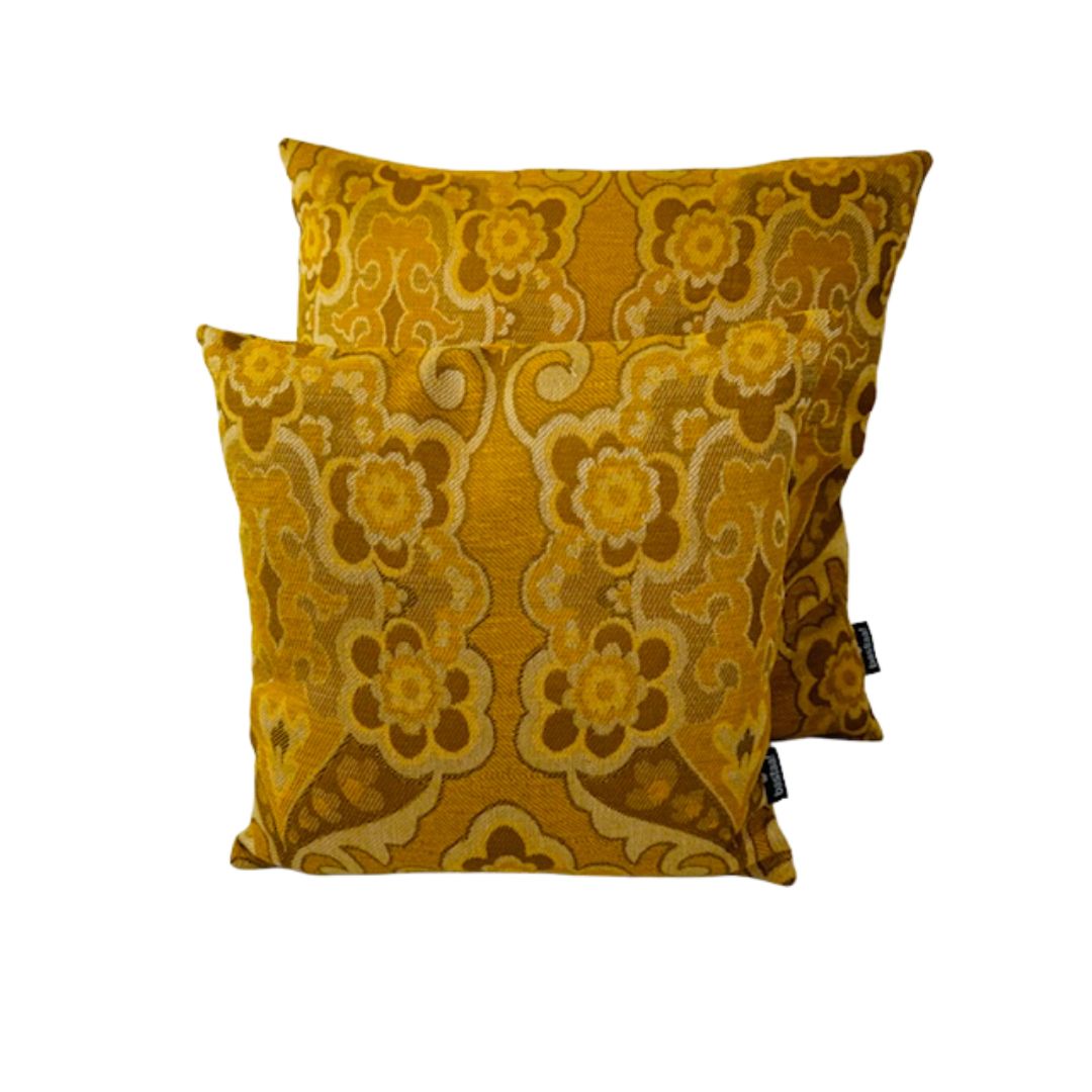 Handgemaakte kussens van vintage stof. Geweven stof met een mooi patroon met bloemen in oker geel. Elk kussen is voorzien van blinde rits en binnenkussen. In verschillende formaten verkrijgbaar.