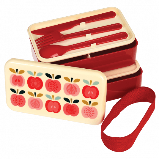 Deze bento box heeft 2 vakken die je makkelijk van elkaar kunt halen. Natuurlijk met mooi bijpassend bestek en een vak heeft een verschuifbaar tussenschotje. Ideaal om je brood, fruit of je salade apart mee te nemen, maar toch alles in 1 vrolijke lunchbox. Alles wordt mooi bij elkaar gehouden door een vrolijk elastiek en heeft de retro look door de gezellige vintage appel.