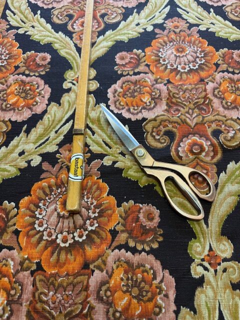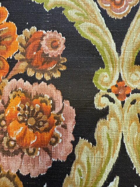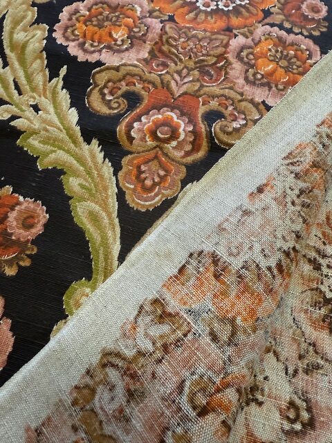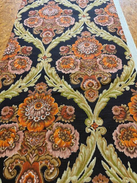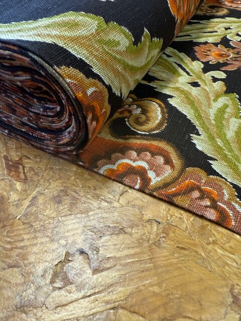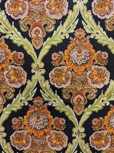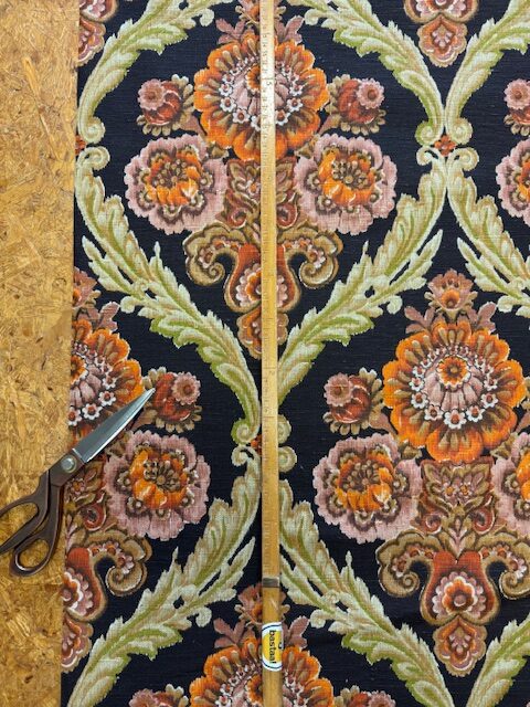 Vintage stof met mooie klassieke bloemen print. In de kleuren bruin, oranje en groen. Unieke jaren ’70 stof, nog ongebruikt op de rol. Voor gordijnen, kussens of lampenkap. Stofbreedte 120 cm.