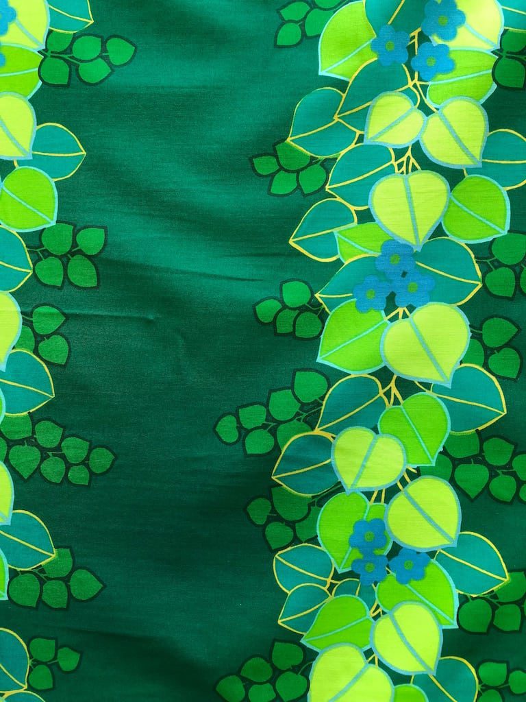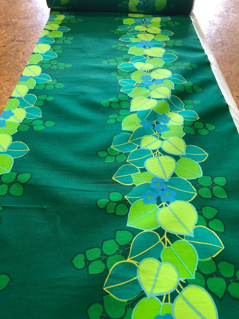Vrolijke vintage stof met een leuk patroon. Bloemen en bladeren in verschillende kleuren groen met een leuk blauw bloemetje als accent. De stof is 120cm breed en natuurlijk origineel uit de jaren '70. Leuk voor bijvoorbeeld gordijnen, kussens, lampenkamp etc.
