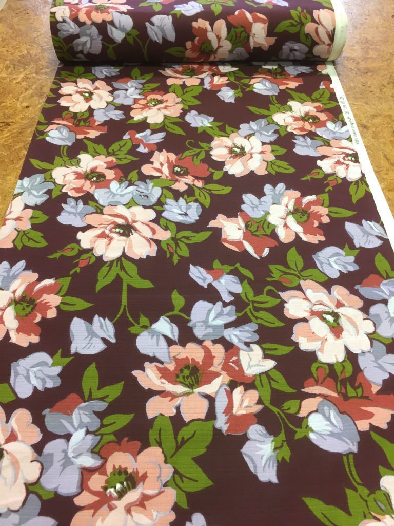Mooie retro stof met prachtige bloemen in verschillende kleuren. De achtergrond kleur is bordeaux rood met stijlvolle bloemen in mooie kleuren. Deze donkerrode stof lijkt net een schilderij. Leuk voor gordijnen, kussens, lampenkap etc.