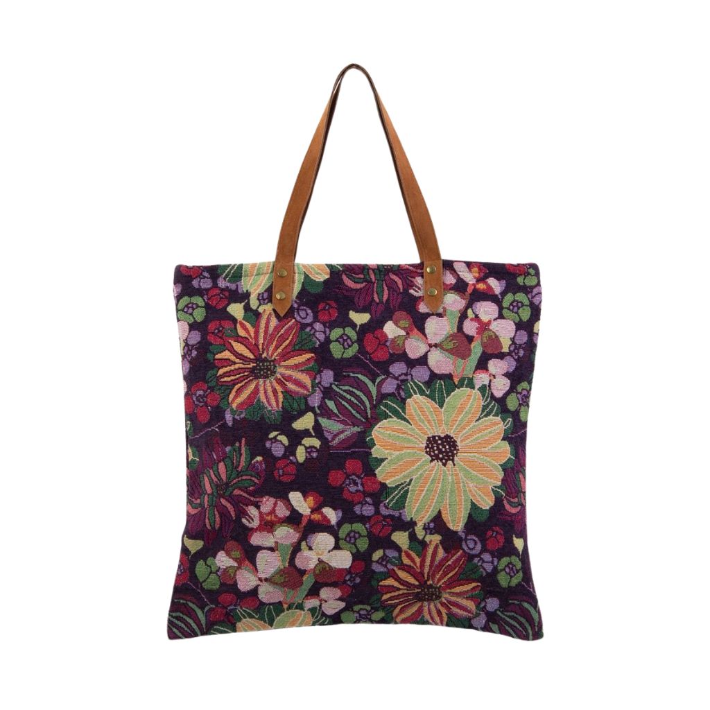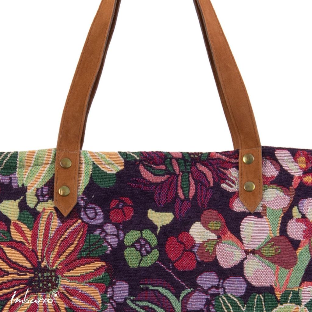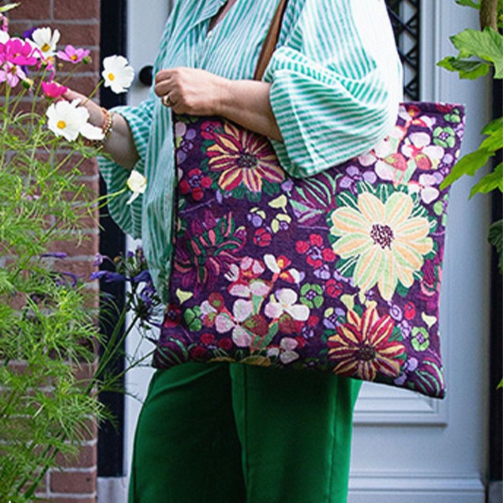 Laat je verrassen door de rijke kleuren van deze bloemen shopper met rits in paars tinten. De combinatie van diepe paarse kleuren, frisse groentinten en speelse bloemen geeft deze tas een bijzondere, bijna artistieke uitstraling. De stevige gobelin-achtige stof met een zachte, fluweelachtige touch maakt het geheel helemaal af.