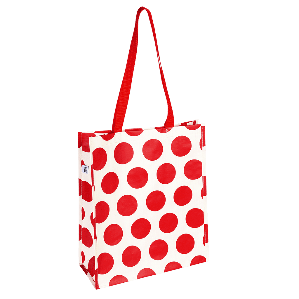 Met deze hippe shopper met grote rode stippen wordt het helemaal een feestje om boodschappen te doen. Deze tas is duurzaam en gemaakt van gerecyclede plastic flessen.