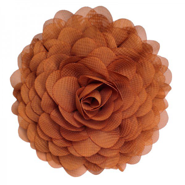 Geef kleur aan je outfit! Natuurlijk met deze bloem corsage van chiffon in de mooie kleur Arabesque ofwel roest bruin - oranje. Met een kleuraccent kun je je jurk, jasje of kapsel net een beetje extra pit of flair geven. Kies een kleur die terugkomt in je kleding of voeg juist kleur toe. Ton-sur-ton is ook erg chique: wat dacht je van deze corsage op je lieve bloemenbloesje? Als je de corsage naast je knot steekt of bij een vlecht net achter je oor dan laat je zien dat je zin hebt in de dag. Klaar voor een feestje!