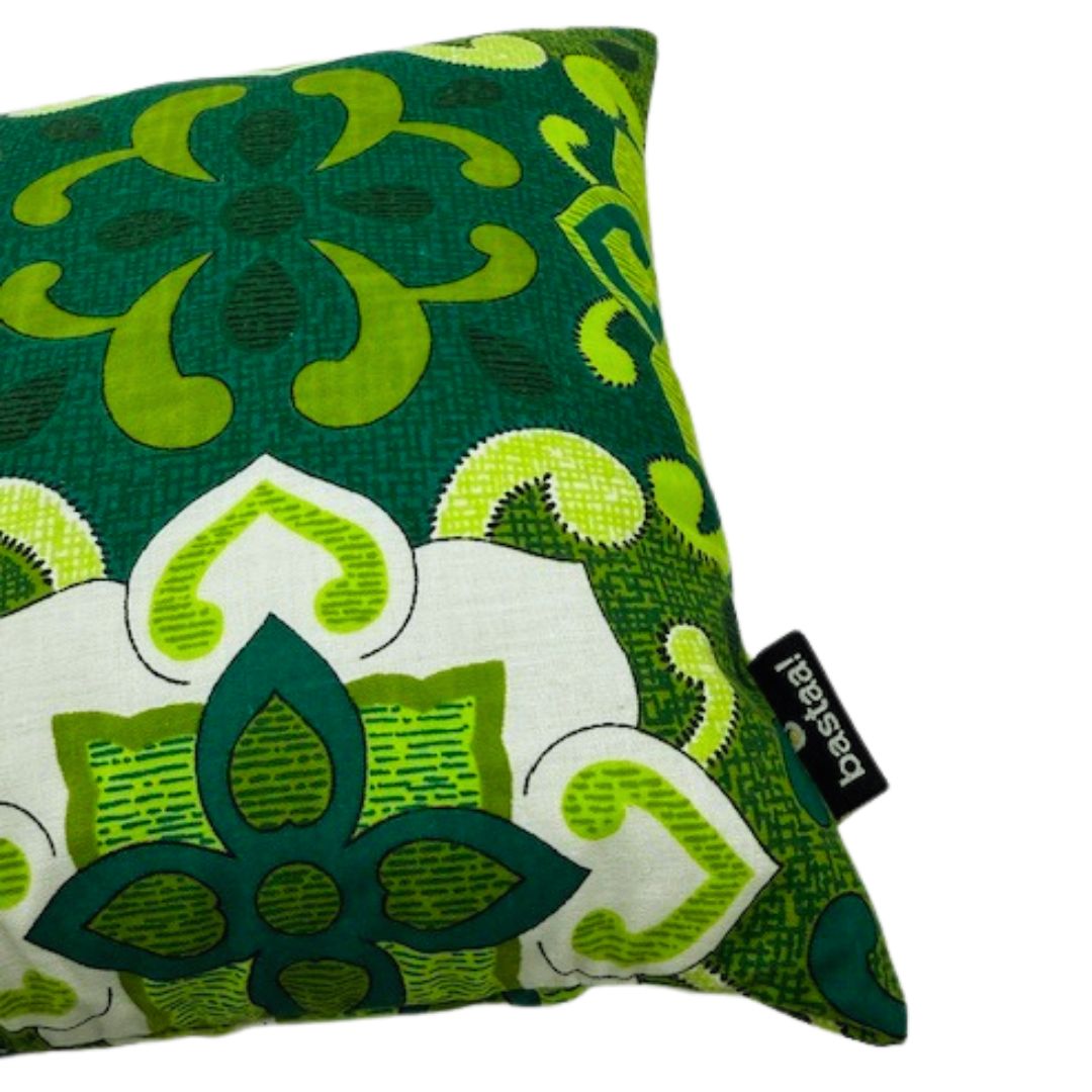 Deze retro kussens zijn handgemaakt van originele vintage stof. Een prachtig Seventies patroon met bloemen en geometrisch patroon in heldere kleuren groen. Natuurlijk is de voor- en achterkant van deze kussens van dezelfde stof, maar door het patroon op de stof zijn de voor- en achterkant nooit hetzelfde. Deze originele jaren '70 stof is een bedrukte stof, mooi van kleur en goed te combineren met veel andere kussens. Wat een heerlijke kleuren waren er toch in de seventies. Wat vind je van deze prachtige kleurencombinatie?