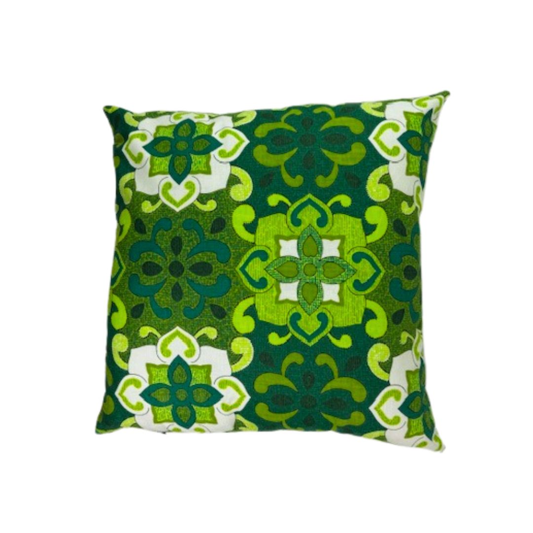 Handgemaakt kussen van vintage stof. Geometrisch en bloemen in helder groene kleur, elk kussen is anders. Kussenhoes met rits, inclusief binnenkussen. Geef zo je interieur een vleugje jaren ’70.