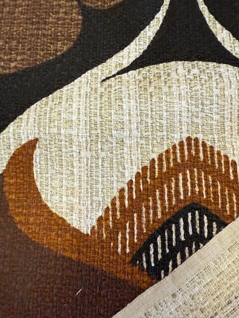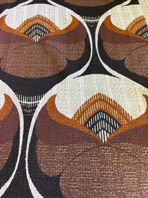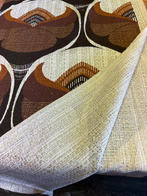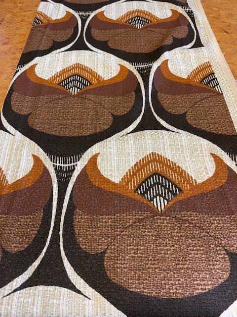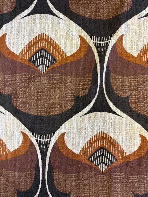 Een originele jaren 70 stof met een herkenbaar patroon. Het formaat van het patroon is ca. 35 x 65 cm. De stof is redelijk los geweven en heeft daardoor een mooie structuur. Natuurlijk kan er altijd een kleine onfeffenheid of stofvouw zichtbaar zijn, maar dit is ook weer de charme van vintage stof. De stof is ongebruikt op de rol.