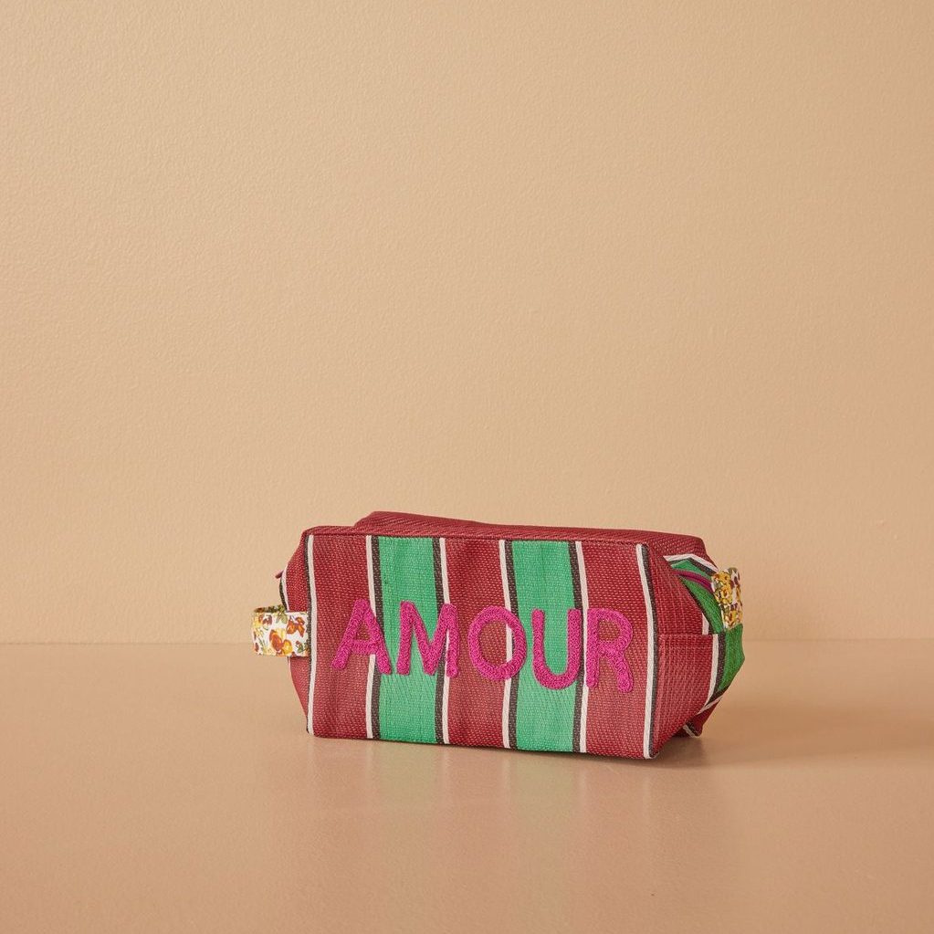 Kleurrijke etui met rits van gerecycled plastic, dus duurzaam. Handig opbergtasje met de tekst “AMOUR”. Retro look voor pennen, make-up, opladers etc.