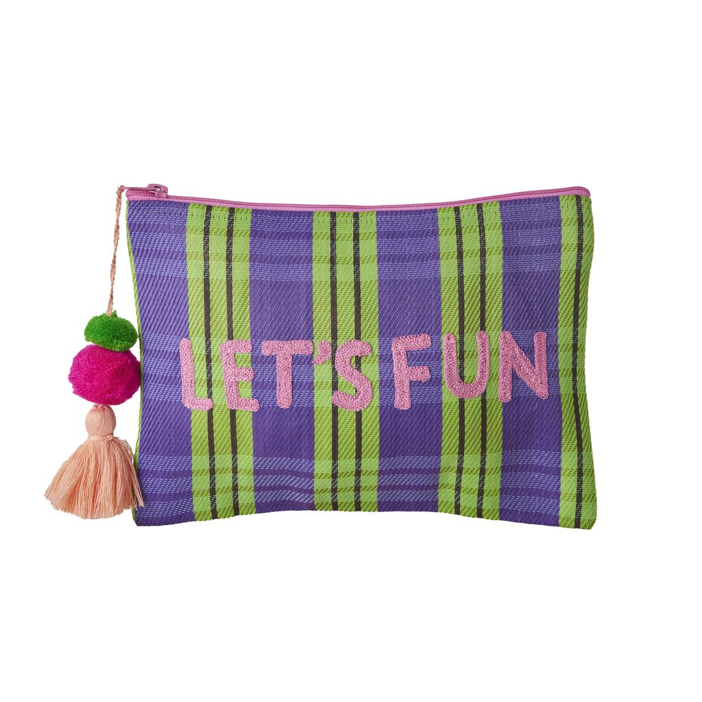 Kleurrijke etui met rits van gerecycled plastic, dus duurzaam. Met groene en paarse strepen, vrolijk kwastje en de tekst “Let’s fun”. Opbergtasje met retro look voor pennen, make-up, opladers etc. Wordt verstuurd als brievenbuspakje.