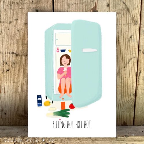 Hippe en vrolijke kaart. Feeling Hot Hot Hot.... Deze retro wenskaart heeft een vrolijke afbeelding. Deze kaartjes, getekend door Esther van Studio Pics & Zo zijn voor groot Ʃn klein een feest om te ontvangen.