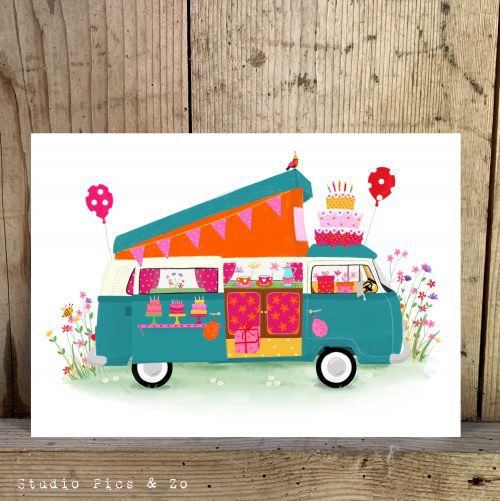 Hippe en vrolijke kaart. Deze retro wenskaart heeft een vrolijke afbeelding van een feestelijke camper, de Happy Birthday Camper. Deze kaartjes, getekend door Esther van Studio Pics & Zo zijn voor groot Ʃn klein een feest om te ontvangen.