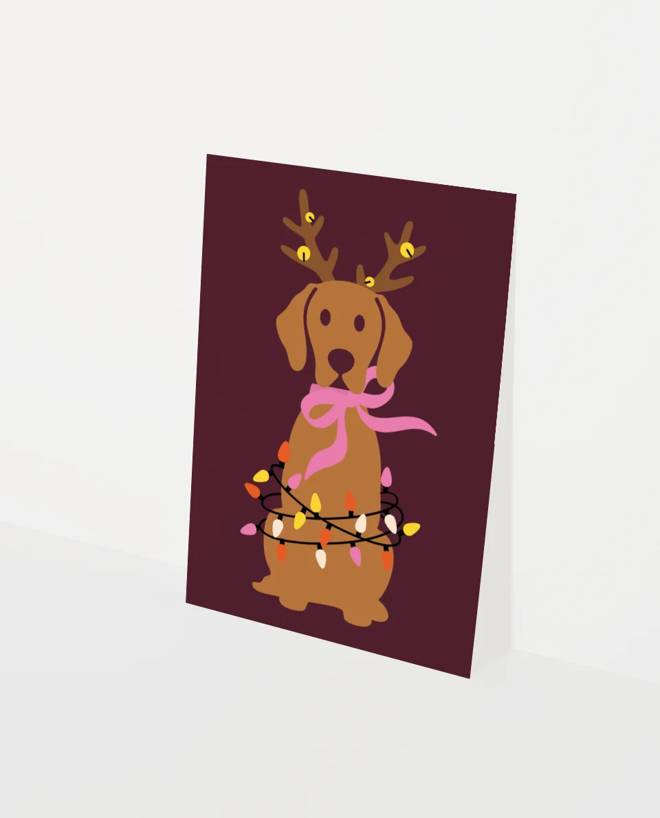Oh deer, het is weer zover. Een snoer vol lichtjes, met een gewei en strik paraat. Sommige honden doen niet aan bescheiden kerstlooks, maar blijven onweerstaanbaar. Deze grappige Heyday honden kerstkaart is perfect om te sturen naar iemand die elk jaar halverwege de versiering vastloopt of gewoon een zwak heeft voor honden met karakter en humor.