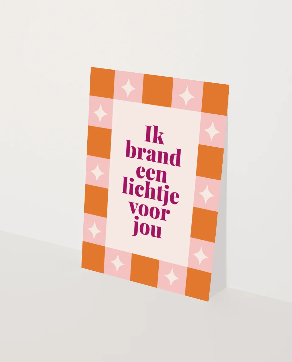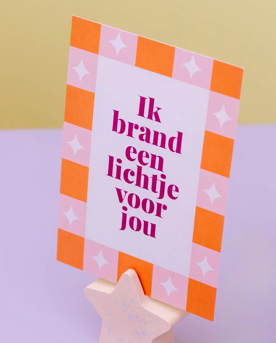 Een warme kaart voor donkere dagen. De Heyday kaart met de lieve tekst "Ik brand een lichtje voor jou", is er voor wanneer het leven anders loopt dan verwacht en iemand wat extra lieve woorden kan gebruiken, met of zonder kerstboom in zicht. Deze kaart is niet speciaal voor kerst maar is altijd een mooi gebaar.