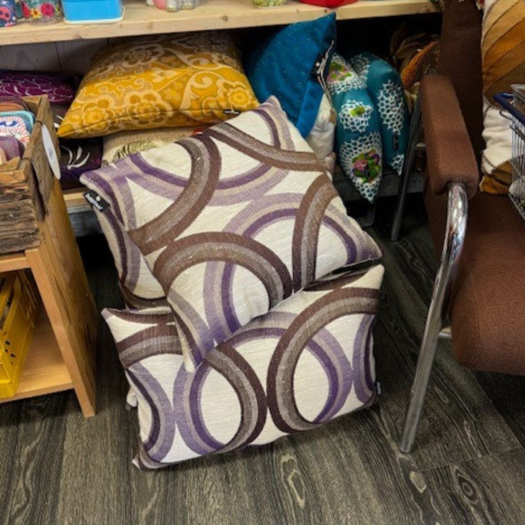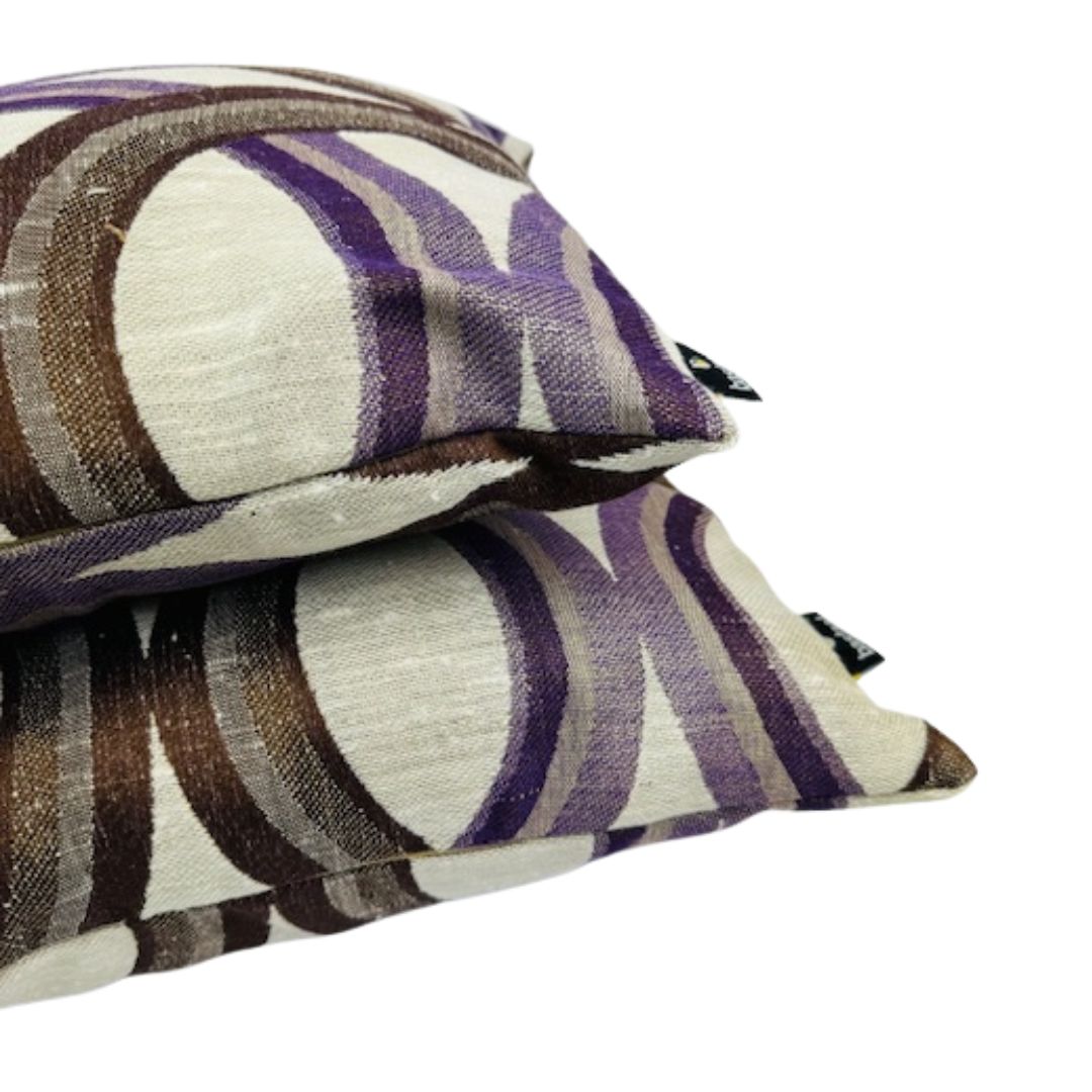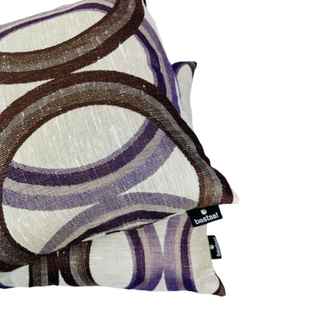 Handgemaakte kussens van vintage stof. Geweven stof met een jaren 70 patroon in paars en bruin. Elk kussen is voorzien van blinde rits en binnenkussen. In verschillende formaten verkrijgbaar.