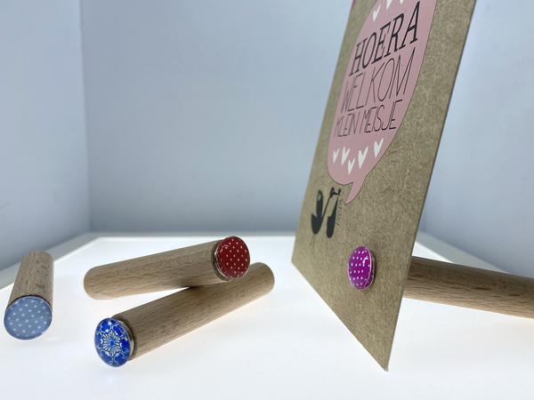 Of je nu een ansichtkaart, vakantiefoto of kunstzinnige print hebt, met deze kaartpin geef je jouw herinneringen een speciale plek. Flexibel, handzaam, persoonlijk en ongelooflijk uniek - dit is geen gewone kaarthouder of fotolijstje; dit is een High5wood-kaartpin! De kaartenhouder bestaat uit 2 delen: beukenhouten staafje en de "Orbs", de glazen bovenkant met afbeelding. Beide met een sterk magneetje. Je plaatst een kaart of foto tussen het stokje en de Orb te plaatsen kun je deze eenvoudig overal neerzetten. Door te schuiven met het stokje kun je jouw foto of kaart op iedere gewenste stand (rechter of schuiner) zetten. Het neemt niet veel ruimte in beslag, dus altijd plek!