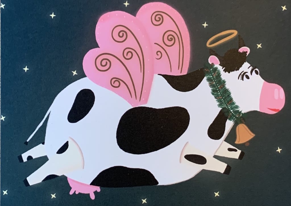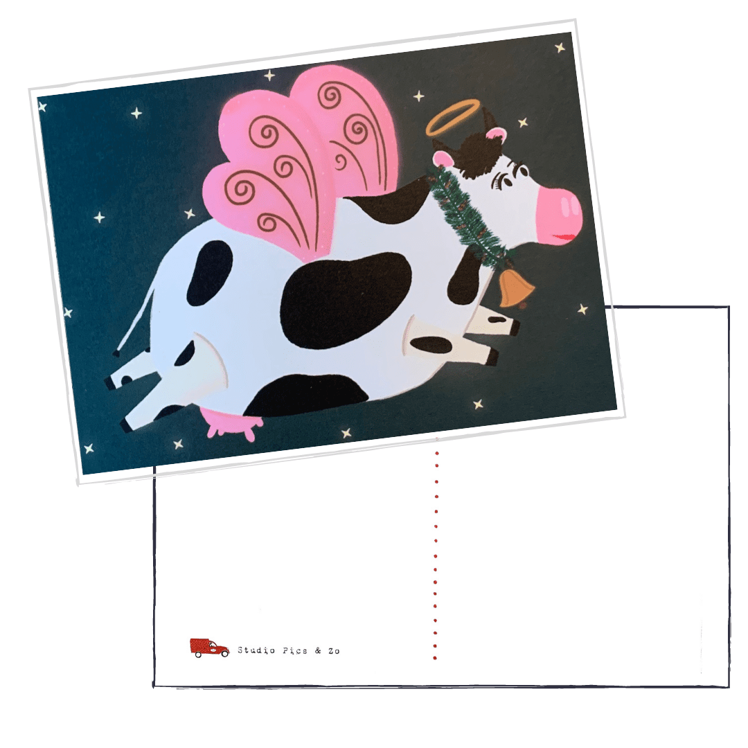 Hippe en vrolijke kerstkaart. Deze retro wenskaart met fantasie en vrolijkheid, kijk 'm gaan deze vliegende koe. Ze zijn voor groot Ʃn klein een feest om te ontvangen. Deze ansichtkaarten zijn zo leuk, dat ze eigenlijk ook wel een (schilderij) lijstje of standaardje verdienen.