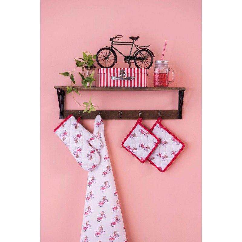 Dit prachtige keukenschort brengt niet alleen kleur, maar ook een authentieke sfeer in huis. De schattige rode damesfiets is verweven in een mooi patroon die haar naam eer aan doet. Een echt Hollands plaatje: de opoe-fiets met een krat vol bloemen voorop. De rode bies met witte stippen staat mooi in contrast met de witte achtergrond.