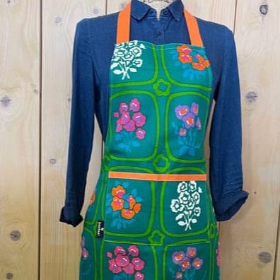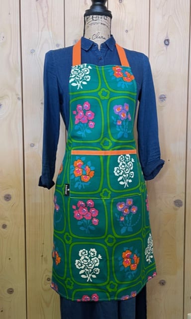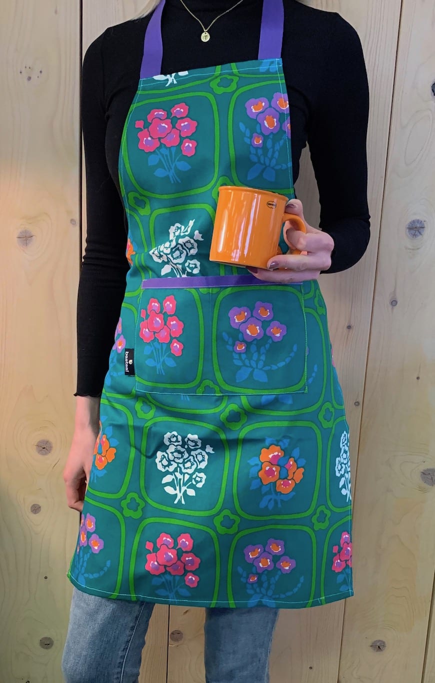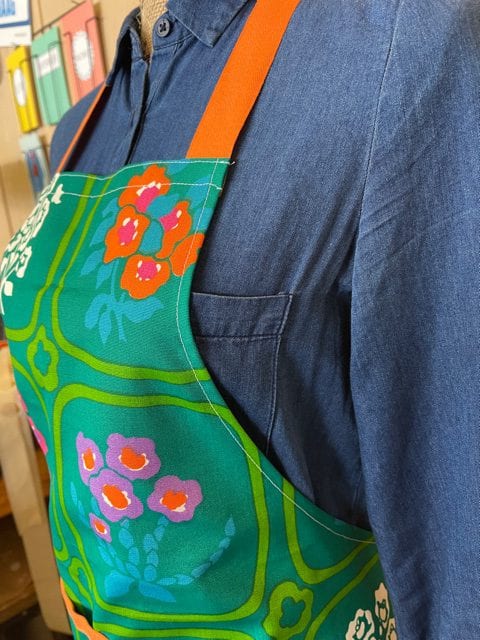 Dit retro keukenschort is handgemaakt van onze vintage stoffen. Zo maak je helemaal een feest van het koken en bakken. Of geef hiermee een retro look aan je BBQ of in de keuken!