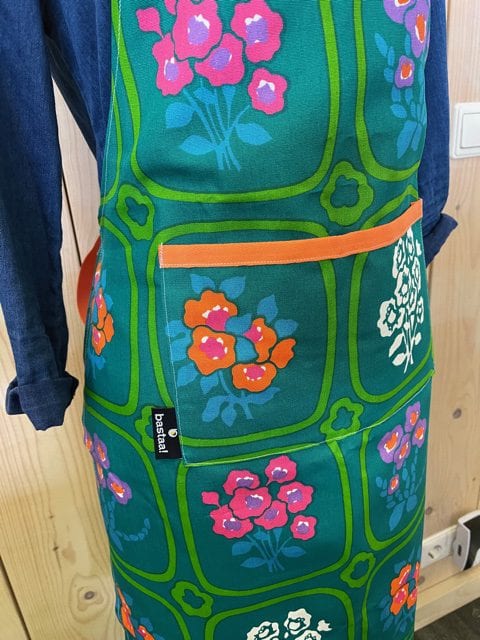 De lengte van het schort is ca. 80 cm en breedte ca. 60 cm. Verder ook een handige zak voorop het schort, zodat jij daar bijvoorbeeld je theedoek in kunt doen. En… let ook op het kleurrijke bandje waarmee je het schort aan de achterkant kan vaststrikken. Het voorvak is als extra accent ook afgebiesd met dezelfde kleur band.