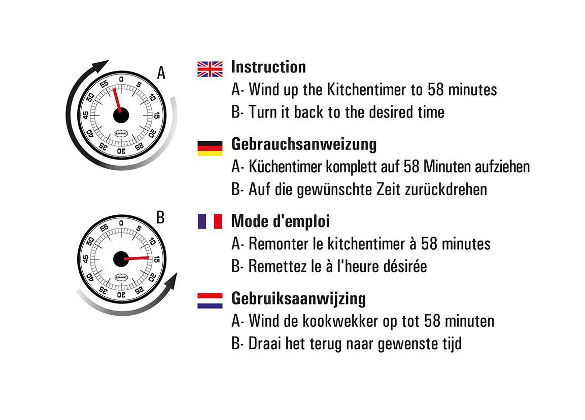 Uiteraard geen batterij nodig! Deze mechanische kookwekker kun je instellen op maximaal 60 minuten.