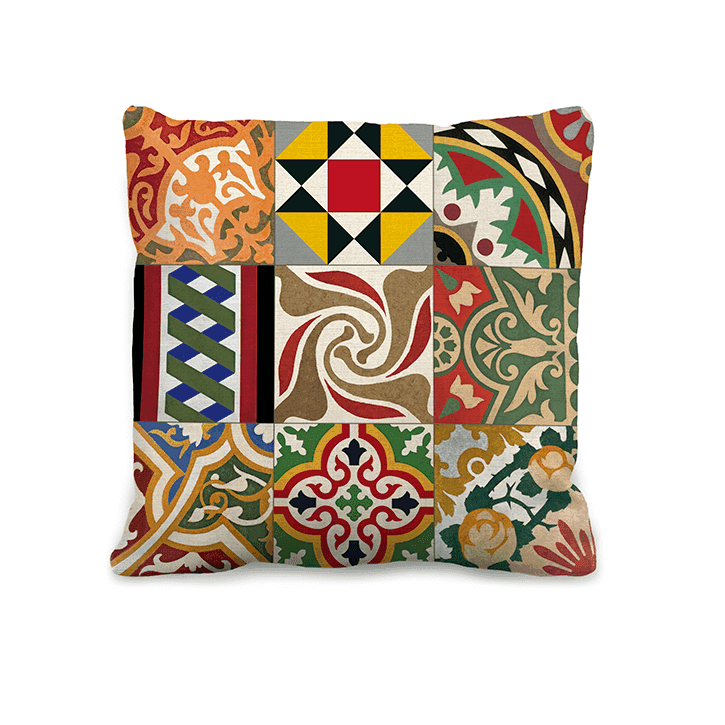 Een kussen met een mooie print van de bekende Spaanse tegeltjes, Modernista Tiles. Deze kussenhoes is voorzien van een rits, zodat je het hoesje kunt wassen. Ook is het kussen aan de voor- en achterkant van dezelfde stof.