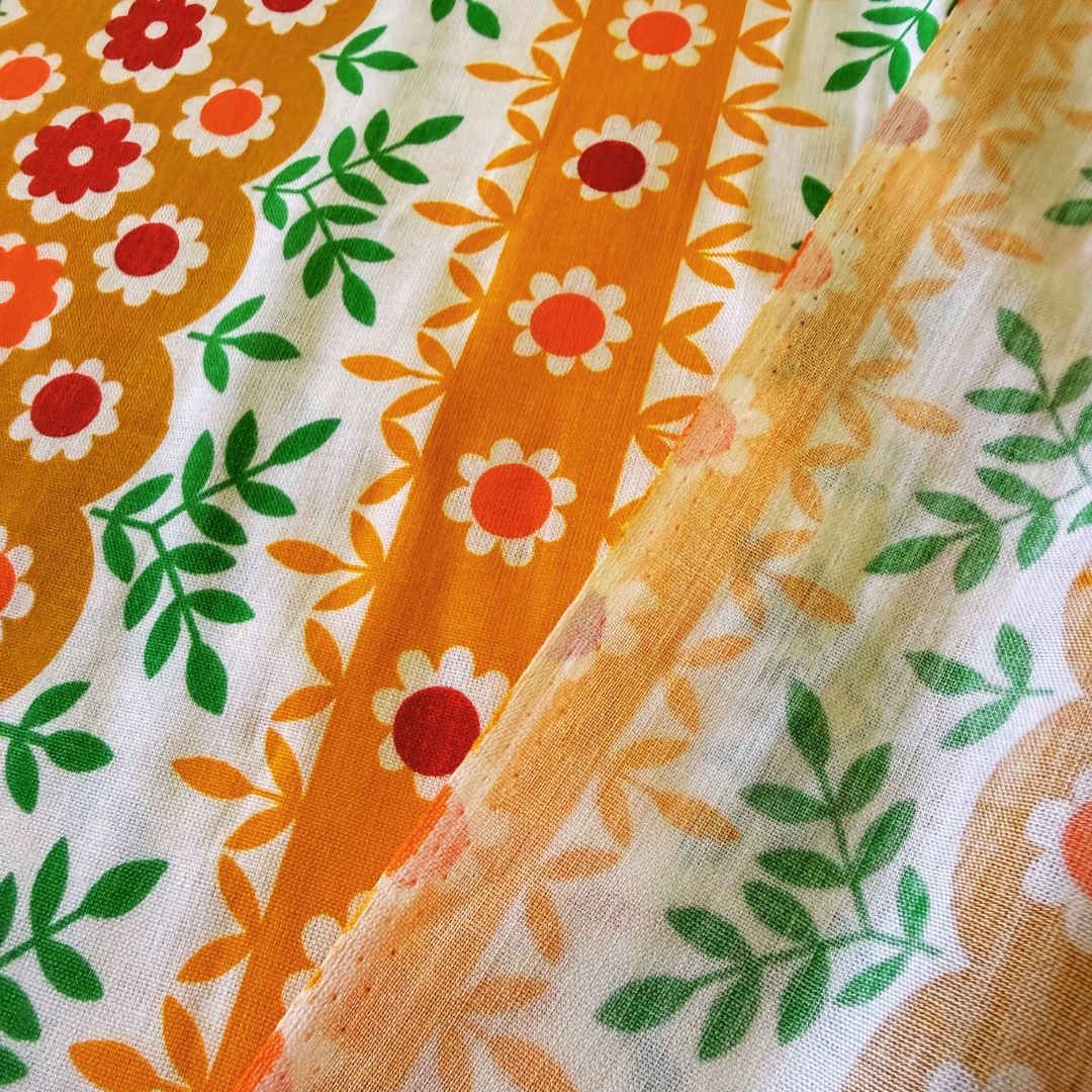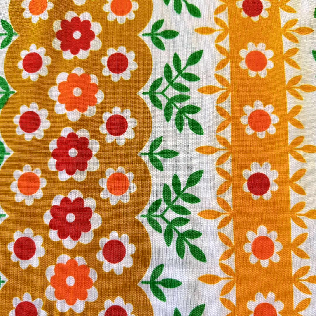 Deze vintage bloemenstof past perfect bij liefhebbers van retro bloemenprints, madeliefjes motieven en vrolijke jaren 70 stoffen.