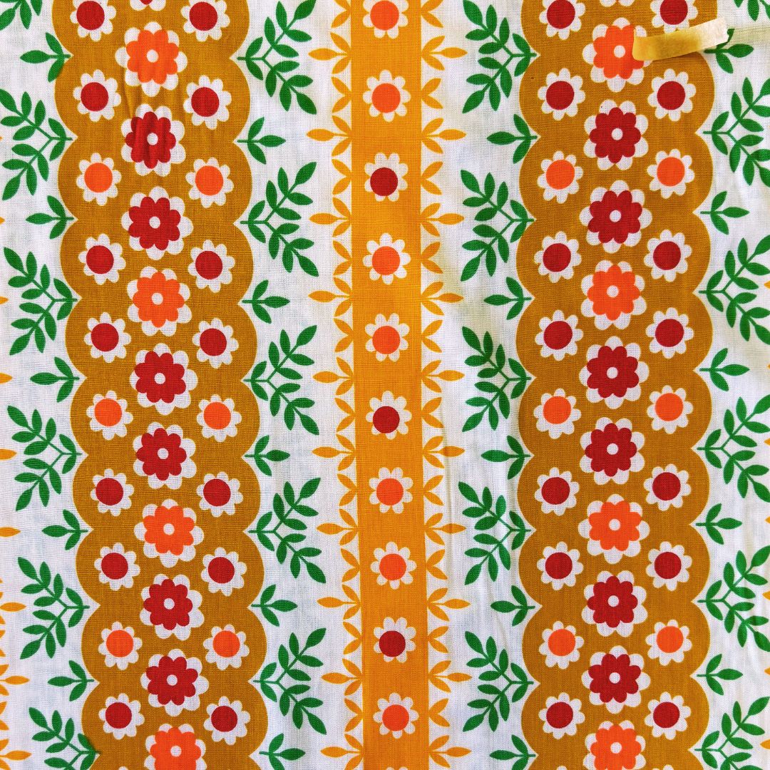 Deze originele vintage stof uit de jaren zeventig heeft een vrolijk patroon met kleine bloemen, bladeren en strepen. De kleuren geel, rood, oranje en groen geven de stof een typische retro uitstraling die direct doet denken aan de vrolijke interieurs uit de seventies.