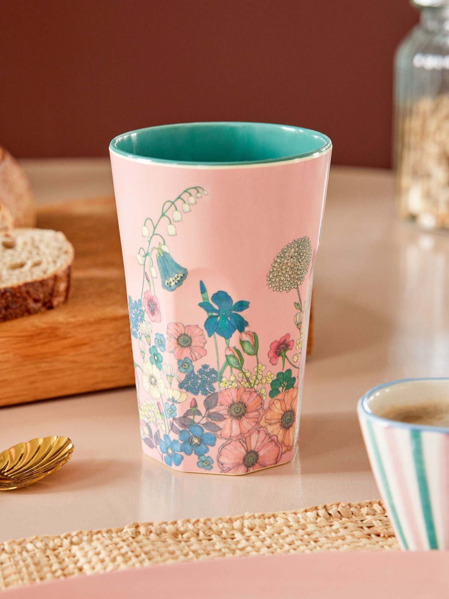 Alweer zo mooie melamine beker large met mooie print. Deze hoge beker van melamine is aan de binnenkant groen. Fijn voor een glas water, sapjes, smoothies of latte Macchiato. Ook leuk om deze beker als bloemenvaasje te gebruiken.