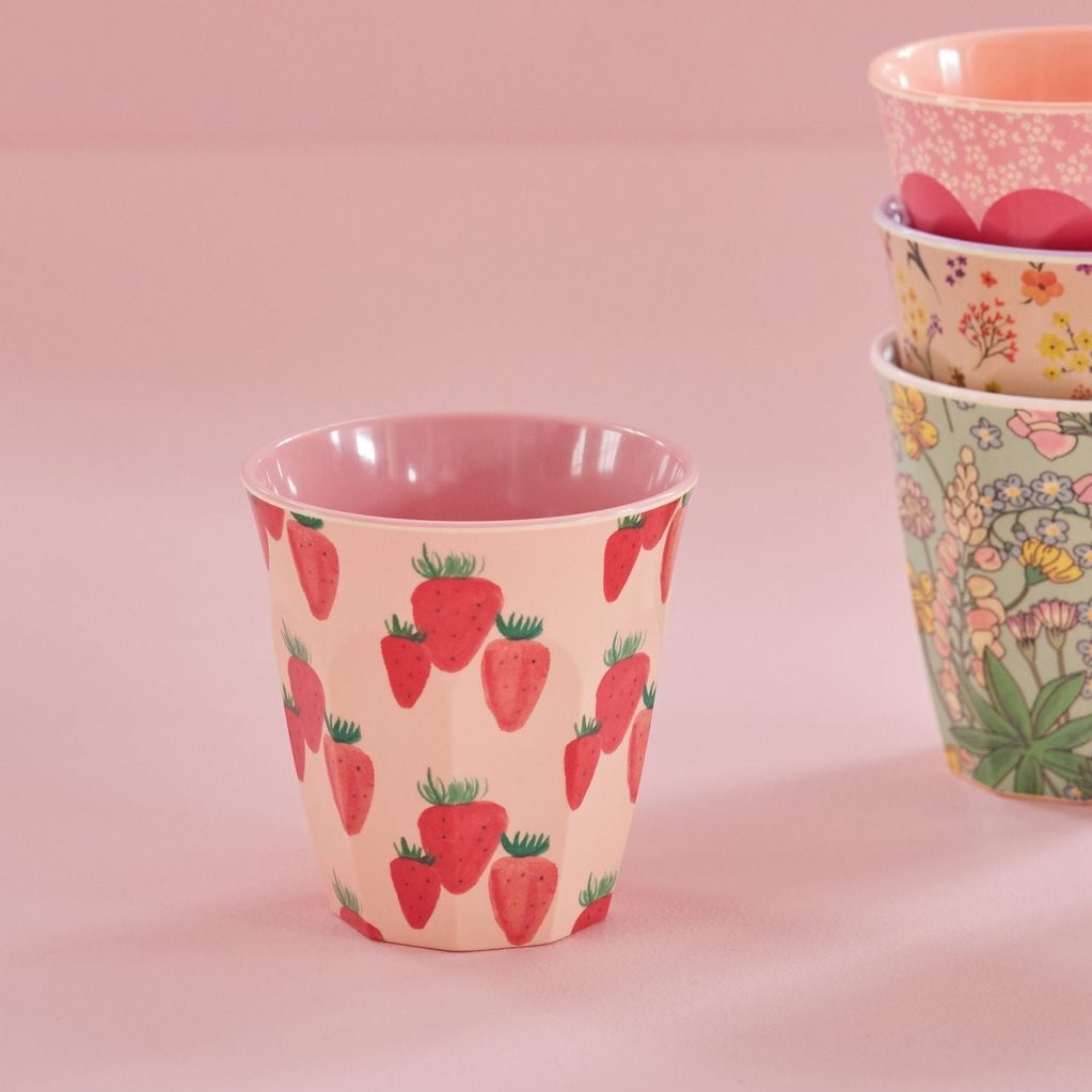 Alweer zo mooie melamine beker medium, nu met de lekkere aardbeien. De binnenkant van deze beker is roze. Deze fantastische beker van met Deense merk Rice brengen kleur en vrolijkheid op tafel. Combineer met de andere prints, alle kleuren zijn fantastisch op elkaar afgestemd. Deze mooie retro bekers zijn ideaal voor groot en klein. Voor thuis, op de camping of tijdens je picknick. Natuurlijk kunnen deze bekers ook in de vaatwasser, hoe fijn is dat? Deze melamine cups zijn zo leuk en handig, dat je ze elke dag wilt gebruiken.Een gezellige beker waarvan jij en je kids spontaan vrolijk worden!