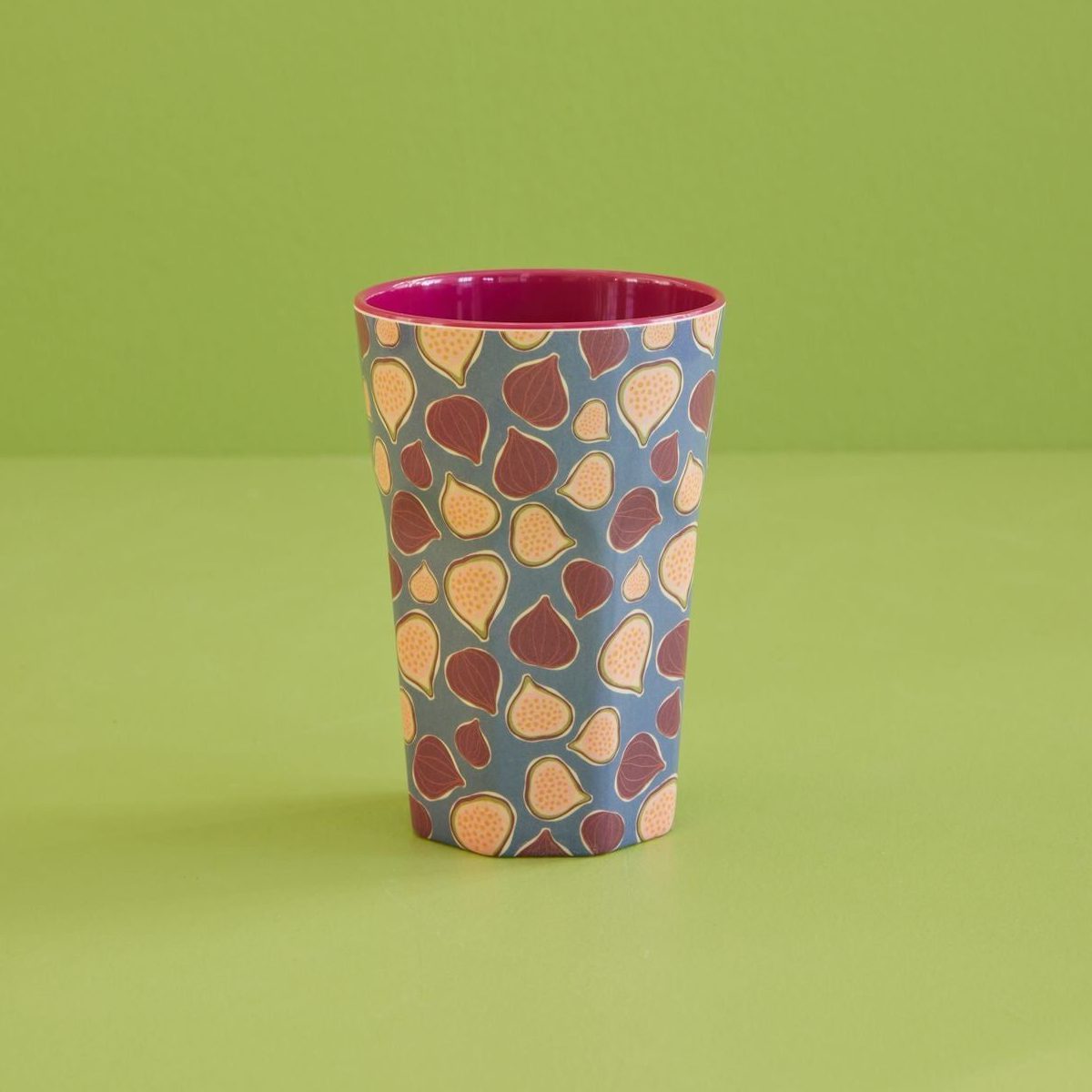 Alweer zo mooie melamine beker large, nu met mooie print van vijgen in de kleuren blauw, roze en paars. Deze hoge beker van melamine is aan de binnenkant in de mooie kleur paars - donkerrood. Fijn voor een glas water, sapjes, smoothie of latte Macchiato. Ook leuk om deze beker als bloemenvaasje te gebruiken.