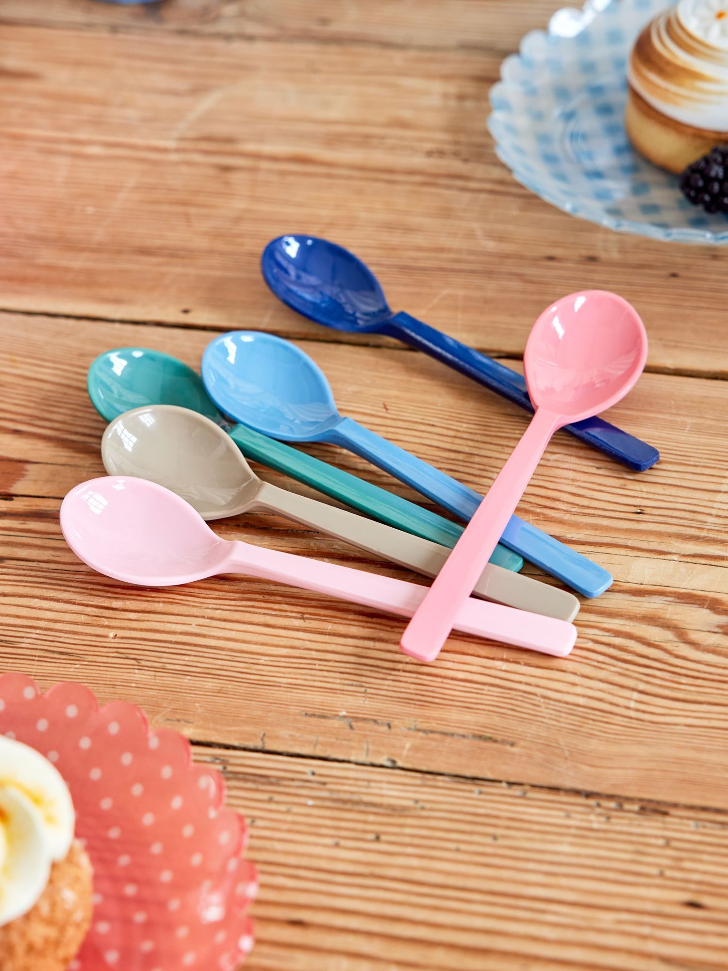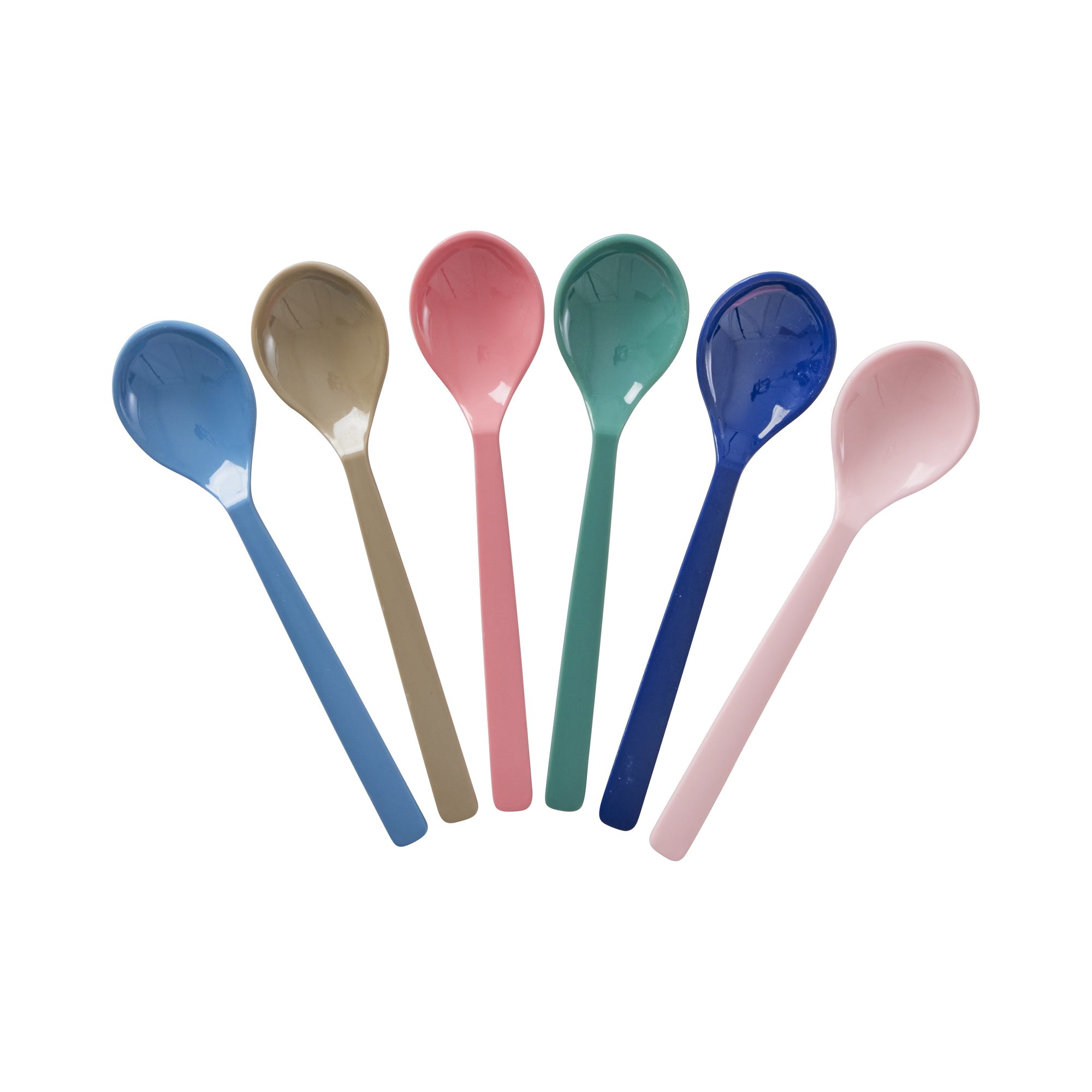 Handige melamine lepels, die perfect passen bij de vrolijke melamine bekers. Deze set bestaat uit zes lepels in verschillende effen kleuren. Ook handig als dessertlepel. Ze kunnen in de vaatwasser. Ideaal bij de medium melamine cups van Rice.Ā