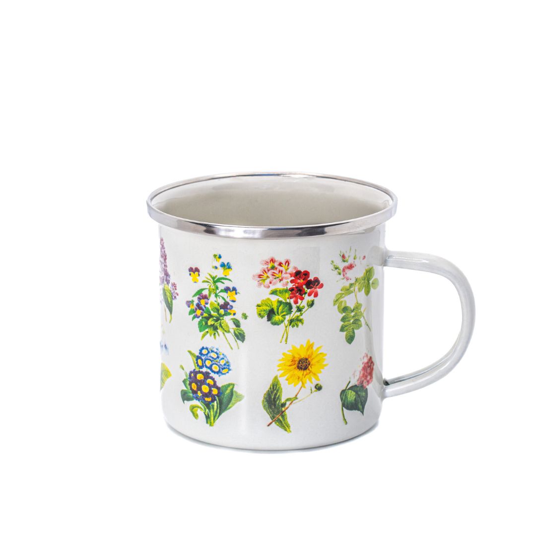 Stevige metalen emaille mok (350 ml) met vrolijke print met bloemen. Lichtgewicht en ideaal voor koffie, thee of soep. Handig voor thuis, onderweg of op de camping.