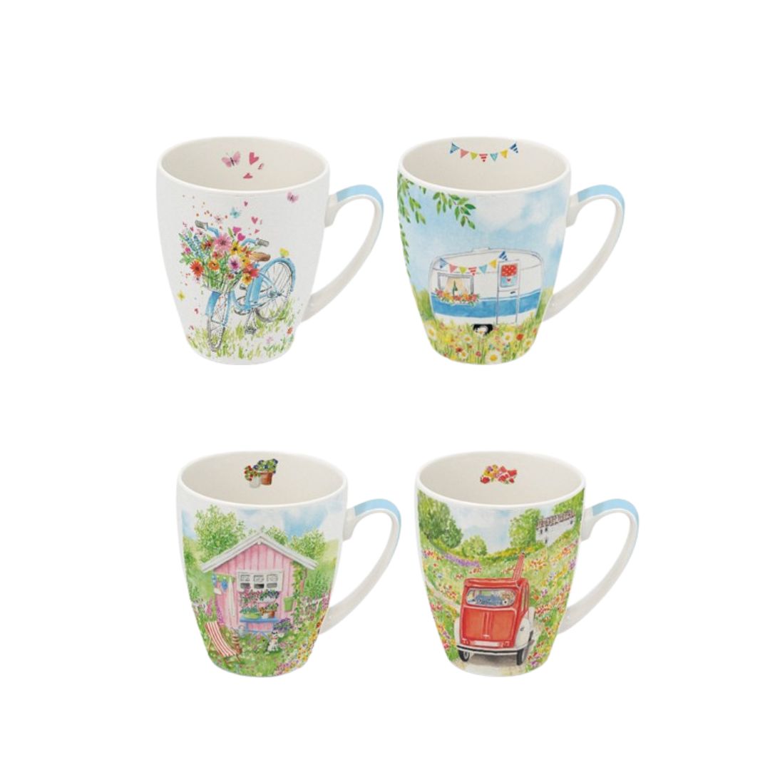 Vrolijke set van 4 mokken met kleurrijk buitenleven design. Deze mokken zijn van keramiek en ruim van formaat. Inhoud 350 ml.