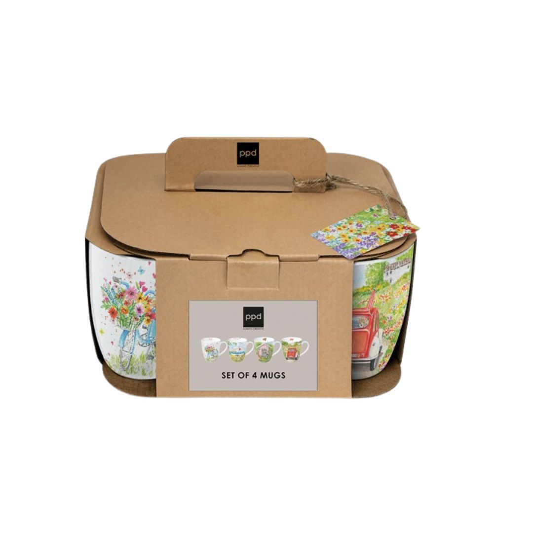 Tromgeroffel⦠deze set van 4 mokken brengt het zomerse buitenleven naar jouw koffie moment! Elke mok heeft een vrolijke buitenāprint: een bloemenfiets, retro caravan, boshuisje en rode "lelijke eend" auto op een landweg. Perfect voor nostalgische gezelligheid tijdens je koffie, thee of warme choco. Die mokkenset wil je toch hebben! Deze prachtige set van vier mokken is van het merk PPD.
