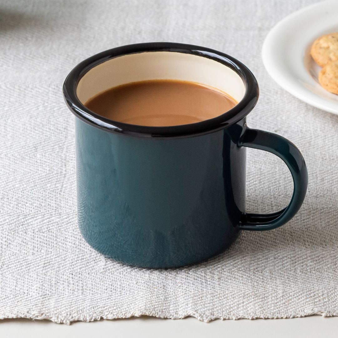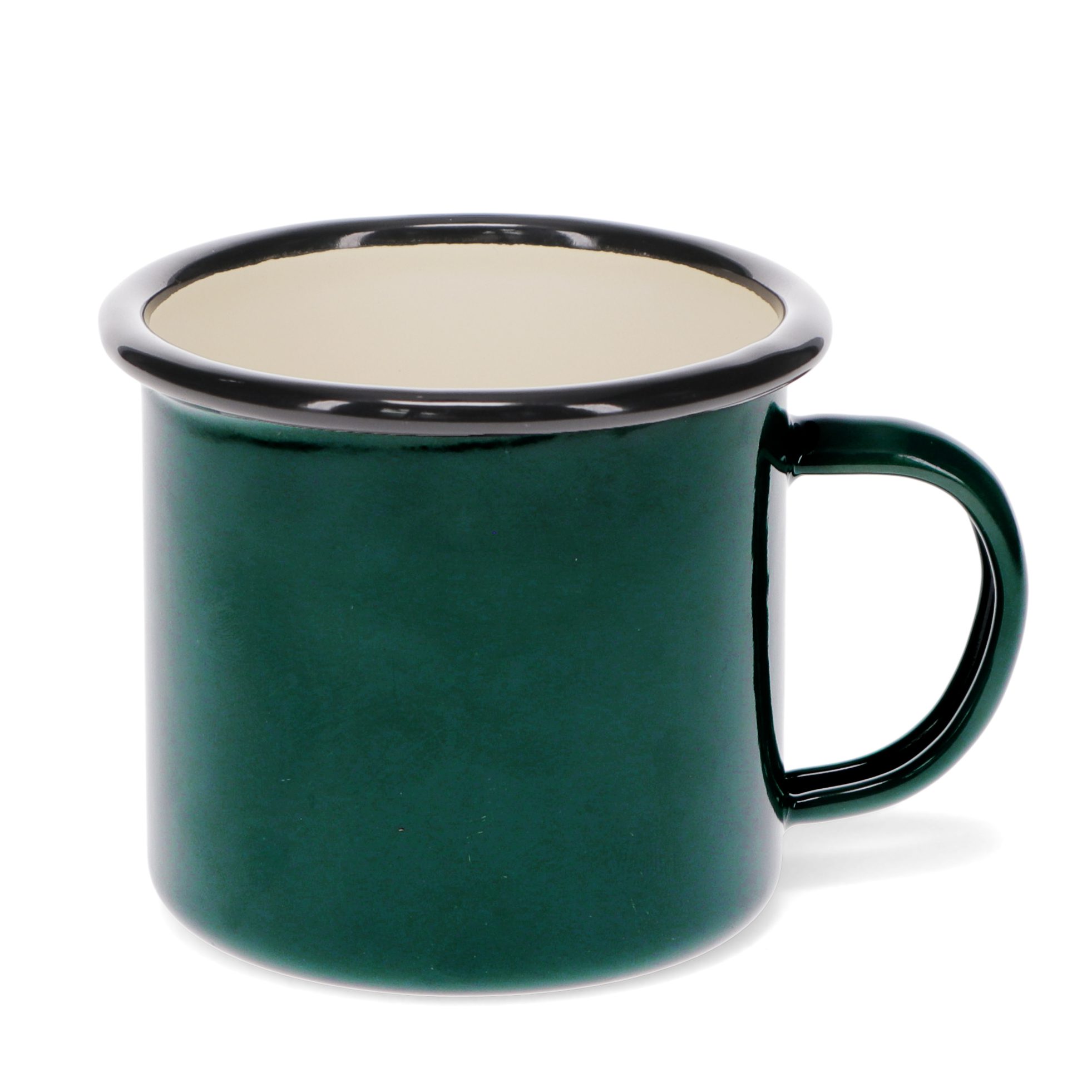 Stevige retro emaille mok (350 ml) in donkergroen met zwarte rand. Lichtgewicht en ideaal voor koffie, thee of soep. Handig voor thuis, onderweg of op de camping.