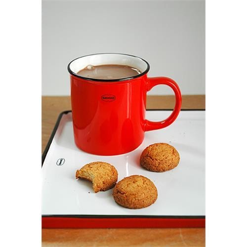 Retro mok van het merk Cabanaz. Deze mokken zijn gebaseerd op het vintage emaille servies, maar dan natuurlijk van keramiek. Let op: Deze rode mokken 250 ml. hebben het logo op de mok, dus niet met een stickertje.