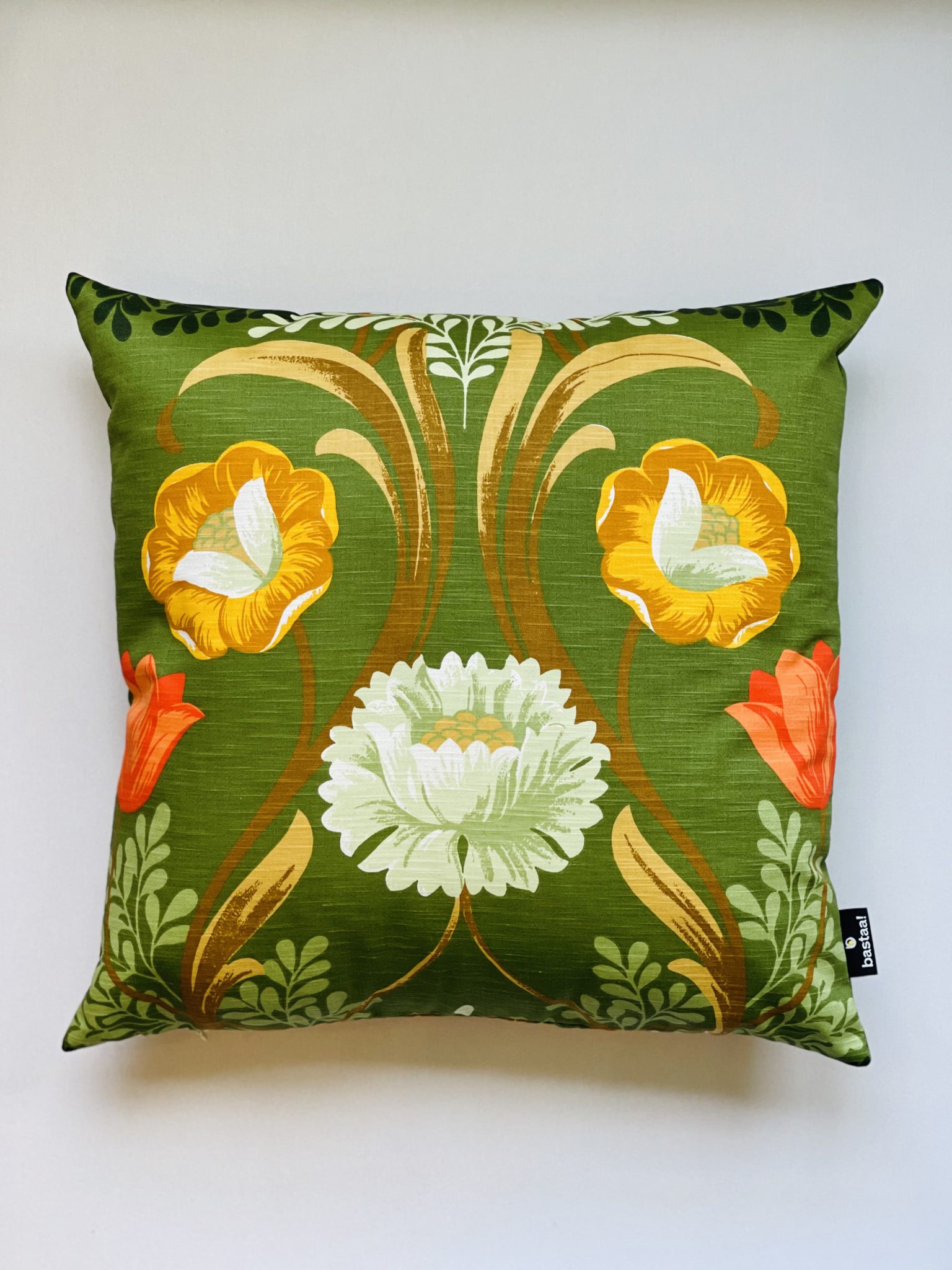 Kussens gemaakt van vintage stoffen geven jouw interieur een heerlijke retro sfeer. Deze stof heeft vrolijke bloemen op een groene ondergrond.