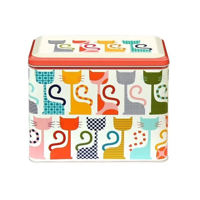 De kleurrijke katten print in jaren ’70 stijl tovert meteen een glimlach op je gezicht. Zet het blik op tafel, in de keuken of op je bureau en geniet van dat warme, nostalgische gevoel. Dankzij het scharnierende klepdeksel raak je de deksel niet kwijt en blijft de inhoud lekker vers.