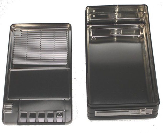 Retro opbergblik in de vorm van een cassette recorder – vintage bewaarblik van metaal