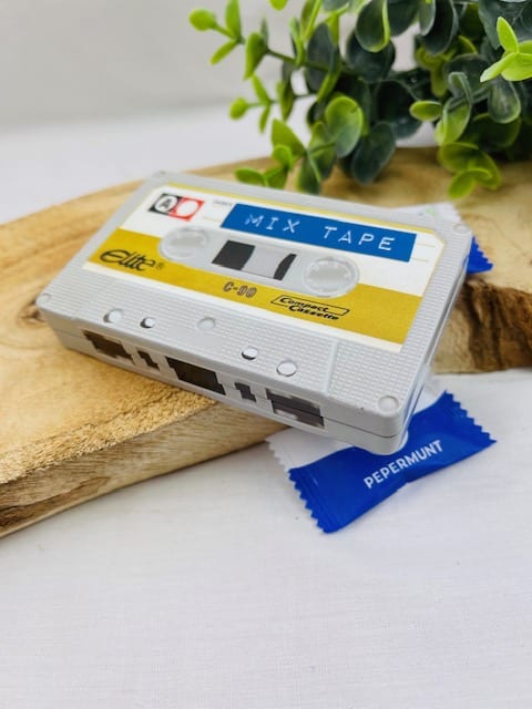 Retro opbergblikje in de van een cassette bandje. Handig voor snoepjes, steekmarkeerder, sieraden etc. Leuk om cadeau te geven met bijvoorbeeld geld, lief briefje of iets anders kleins. Ook handig voor in je tas. Voor de echte retro muziek liefhebber.