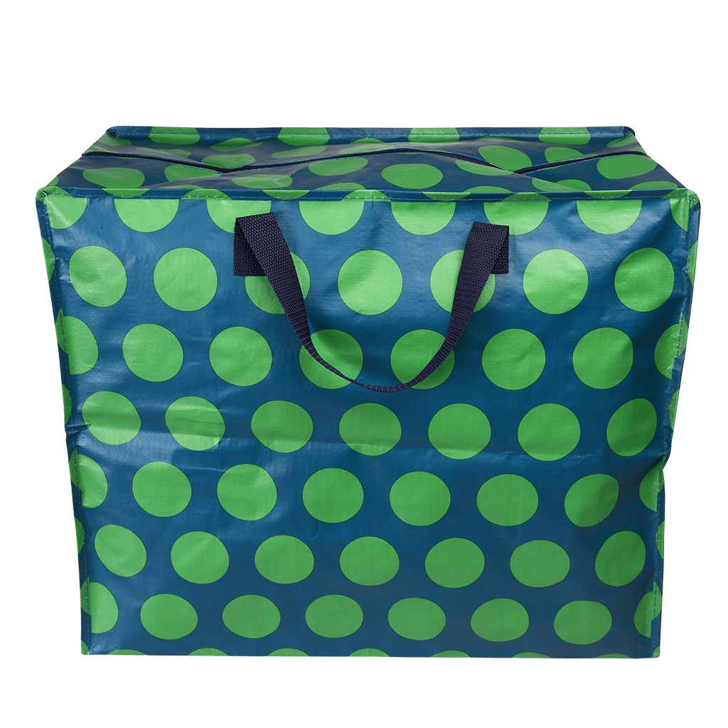 XL shopper of opbergtas uit de serie Spotlight. Vrolijke grote groene stippen op blauwe ondergrond. Zo lekker groot om alles in ƩƩn keer mee te kunnen nemen naar je weekendje weg, het strand of zwembad. Ideaal voor het opbergen van speelgoed, kleding, linnengoed.... In deze opbergtas met vrolijke stippen kan zo veel en is superhandig. Opruimen wordt een feestje voor groot en klein met deze tas. Ga je naar de camping? Gebruik dan ook deze tas als bijvoorbeeld wastas. De ideale vakantie tas!