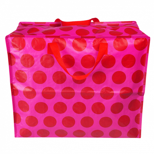 XL shopper of opbergtas uit de serie Spotlight. Vrolijke grote rode stippen op knalroze ondergrond. Zo lekker groot om alles in ƩƩn keer mee te kunnen nemen naar je weekendje weg, het strand of zwembad. Ideaal voor het opbergen van speelgoed, kleding, linnengoed.... In deze opbergtas met vrolijke stippen kan zo veel en is superhandig. Opruimen wordt een feestje voor groot en klein met deze tas. Ga je naar de camping? Gebruik dan ook deze tas als bijvoorbeeld wastas. De ideale vakantie tas!