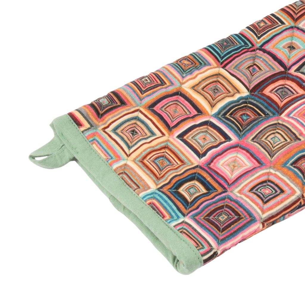 Set van 2 gewatteerde ovenwanten met vrolijke retro print. Hittebestendig katoen met ophanglus. Kleurrijk, praktisch en onmisbaar in elke keuken.