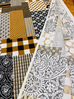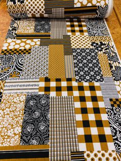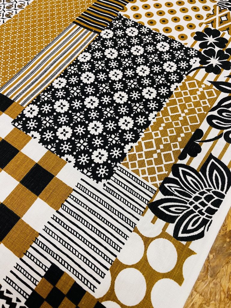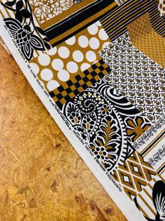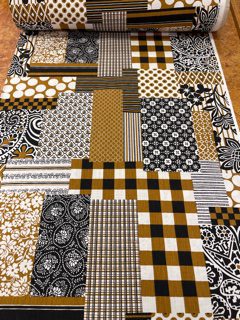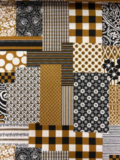 Deze originele jaren '70 stof leuk patchwork patroon in de kleuren bruin, zwart en ecru. Door het prachtige patroon kun je de stof voor allerlei doeleinden gebruiken. De stof is bedrukt, zie ook de foto's.