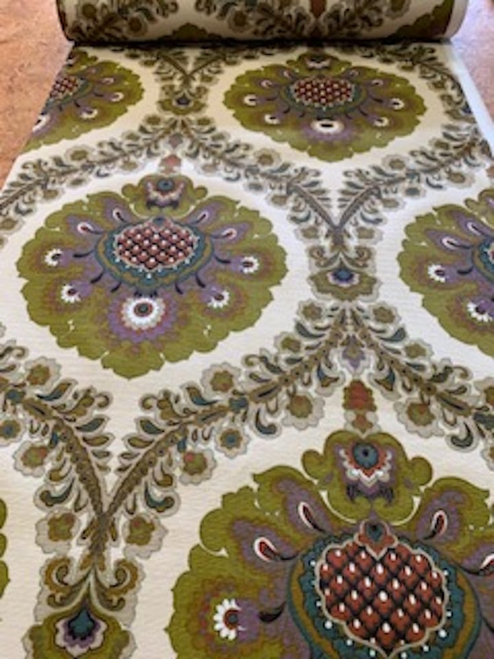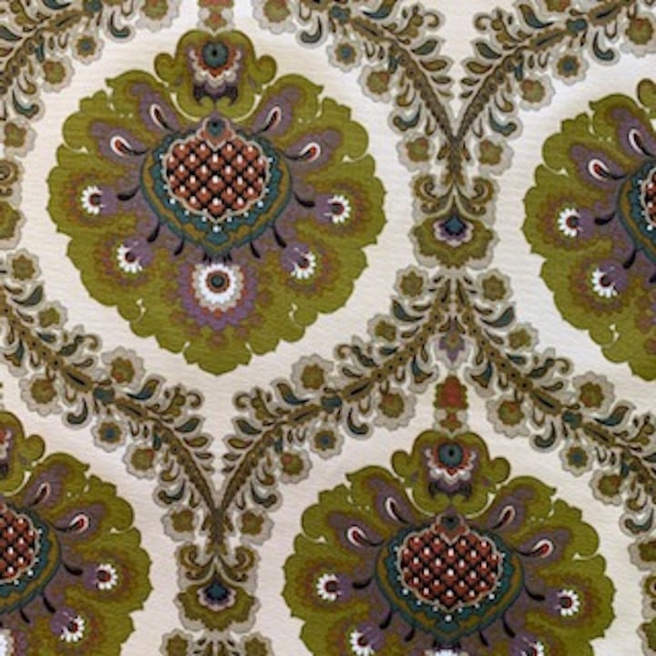 Mooie vintage stof met vrolijk patroon in een mooie kleurencombinatie met groen op een lichte ondergrond. Deze redelijk stevige retro gordijnstof heeft de prachtige jaren '70 kleuren en een mooi groot patroon. De stof is 120cm breed en natuurlijk origineel uit de jaren '70. Leuk voor bijvoorbeeld gordijnen, kussens, lampenkamp etc. Voel je weer Back to the Seventies!