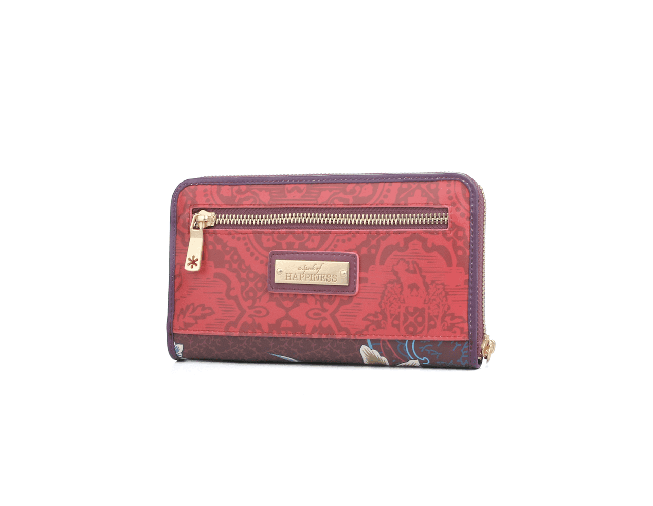 Met deze ruime portemonnee heb jij echt iets bijzonders. Gemaakt van vegan leather in een mooie kleuren rood en sluit met een rits. De voorkant van de portemonnee heeft een mooi bloemen patroon. De andere zijde heeft een extra vakje met rits, het mooie labelĀ  "a Spark of Happiness" en weer een andere frisse print. De ritsen van deze hippe damesportemonnee zijn in goudkleur. Let ook eens op de mooie zippers met bloemetje, weer zo'n mooi accent. De binnenzijde is van stof polyester in de kleur donkerrood.