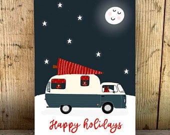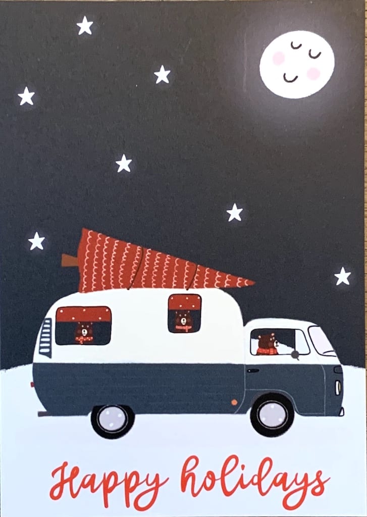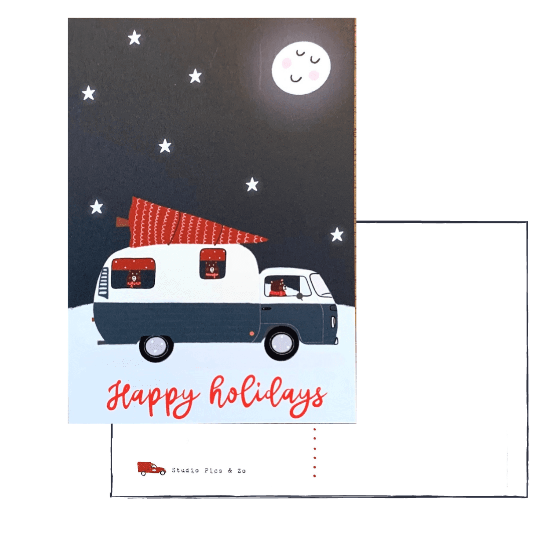 Hippe en vrolijke kaart. Deze retro wenskaart heeft een vrolijke afbeelding en is geweldig als bijvoorbeeld kerstkaart. Winterse afbeelding met zo'n gezellige retro camper. Ze zijn voor groot Ć©n klein een feest om te ontvangen. Deze ansichtkaarten zijn zo leuk, dat ze eigenlijk ook wel een (schilderij) lijstje of standaardje verdienen. Deze kaartjes zijn ontworpen door Esther van Studio Pics & Zo. Natuurlijk met een knipoog naar de Seventies. Wie verras jij met zoān mooi handgeschreven kaartje? Deze fantastische kaarten van Studio ReispaleisĀ toveren een glimlach op je gezicht!