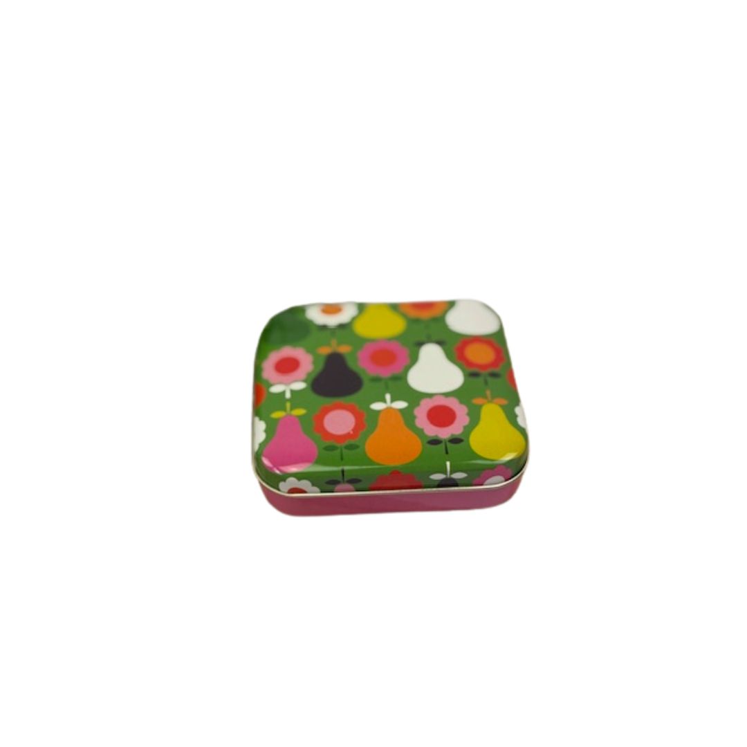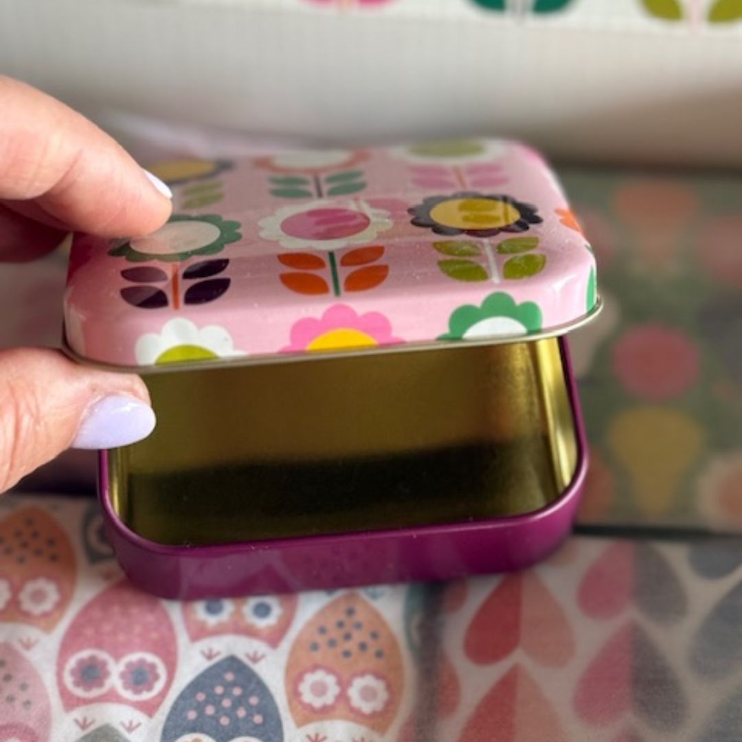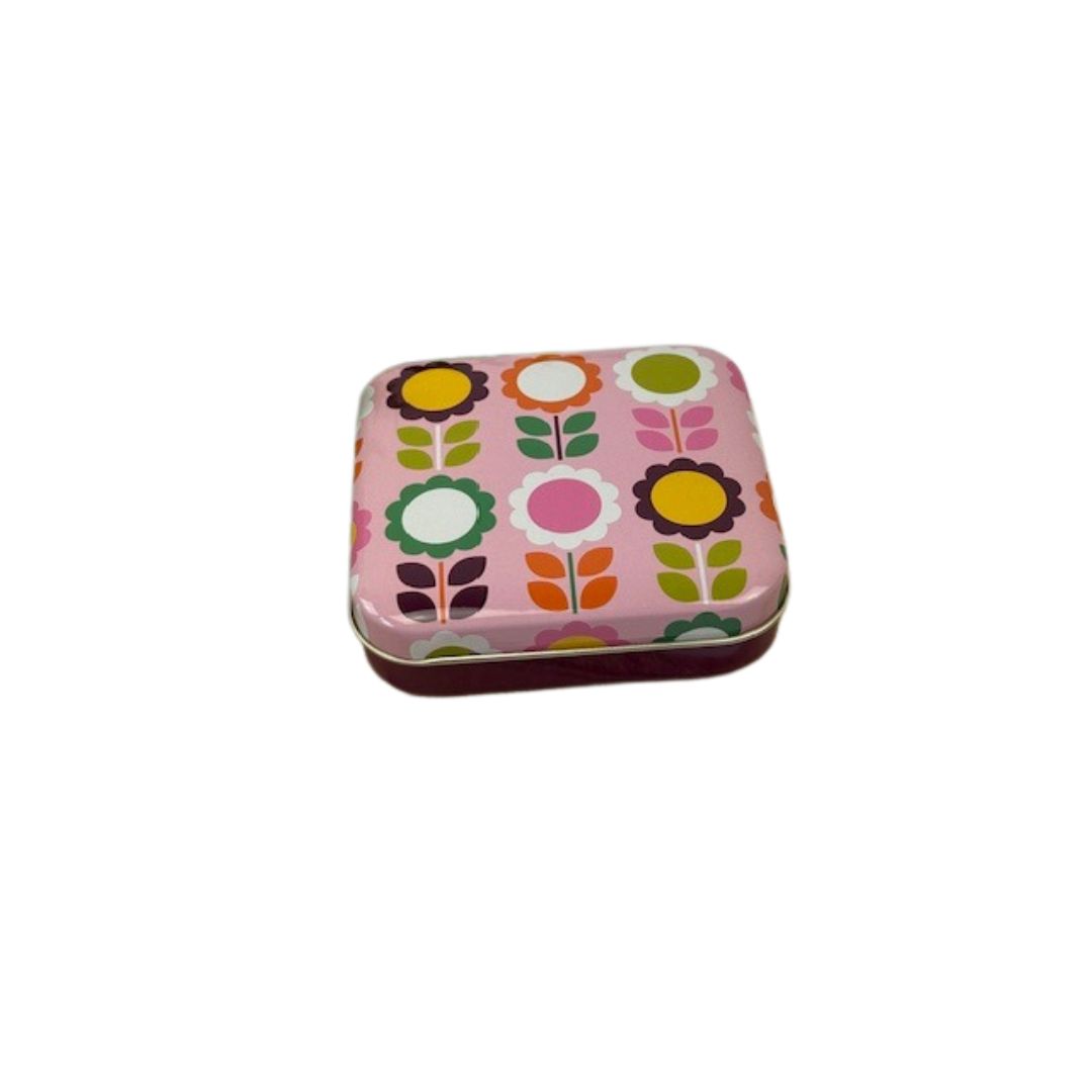 Breng kleur in je dag met dit kleine retro blikje van ontwerpster Kate Rhees! Dit vierkante opbergblikje combineert praktische opbergruimte met een flinke dosis flowerpower. Ideaal voor iedereen die dol is op vrolijke prints, een vleugje nostalgie en handige opbergdoosjes. Ideaal voor snoepjes, sieraden, medicijnen of andere kleine spulletjes.