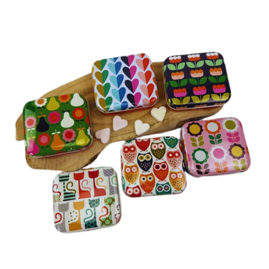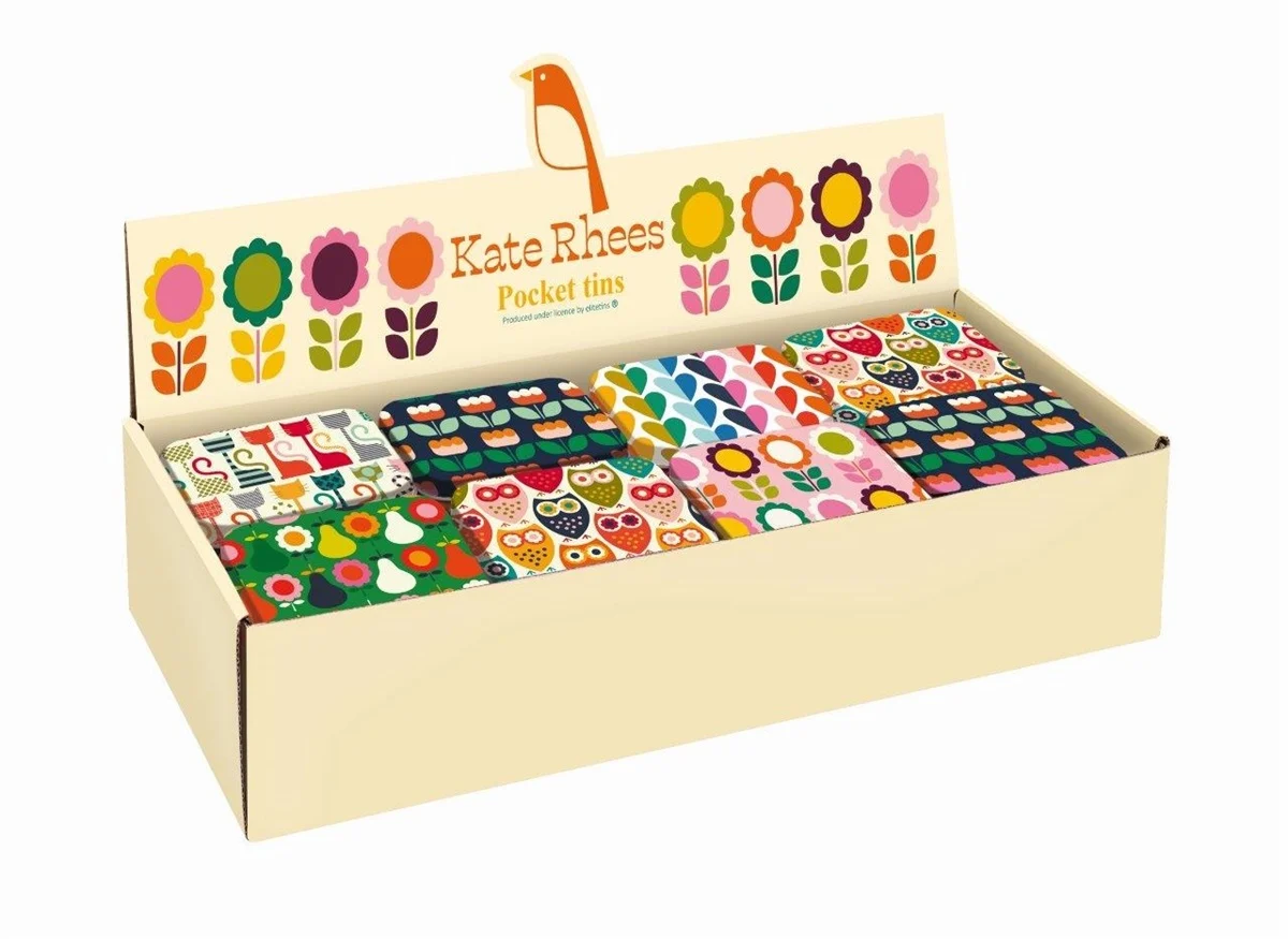 Kleurrijk retro opbergblikje van Kate Rhees met klepdeksel. Keuze uit 6 vrolijke designs. Handig voor snoepjes, theezakjes of als cadeau!